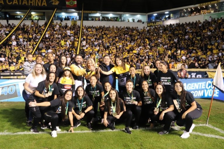 A Unesc, grande parceira do clube também no projeto de incentivo ao futebol feminino, participou da celebração e recebeu simbolicamente o troféu da competição ao lado da presidência do Clube e da Fundação Municipal de Esportes de Criciúma.