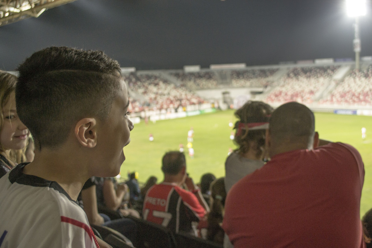 Também foi a primeira vez da Raissa da Silva, 10 anos, em um estádio. Acostumada a assistir futebol pela televisão, sentiu grandes diferenças. “É diferente de ver pela TV, por lá a imagem é muito perto, aqui dá para ver o jogo acontecendo de verdade”, explica.