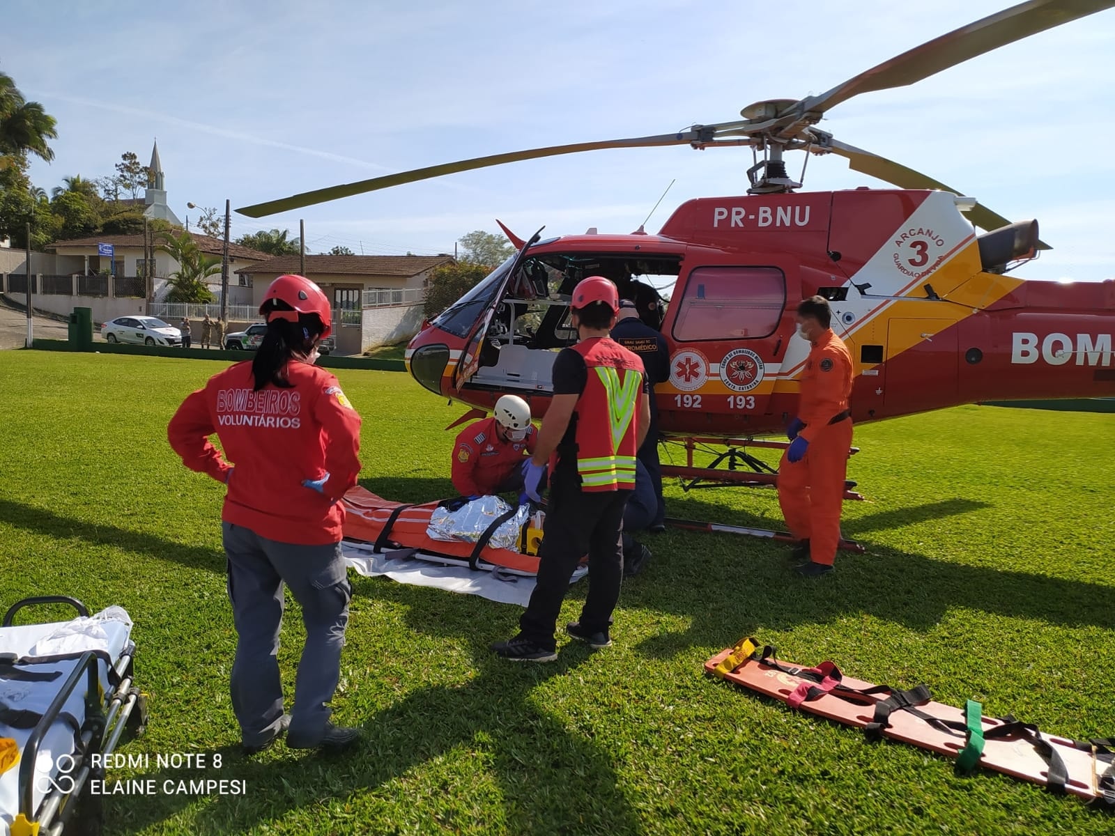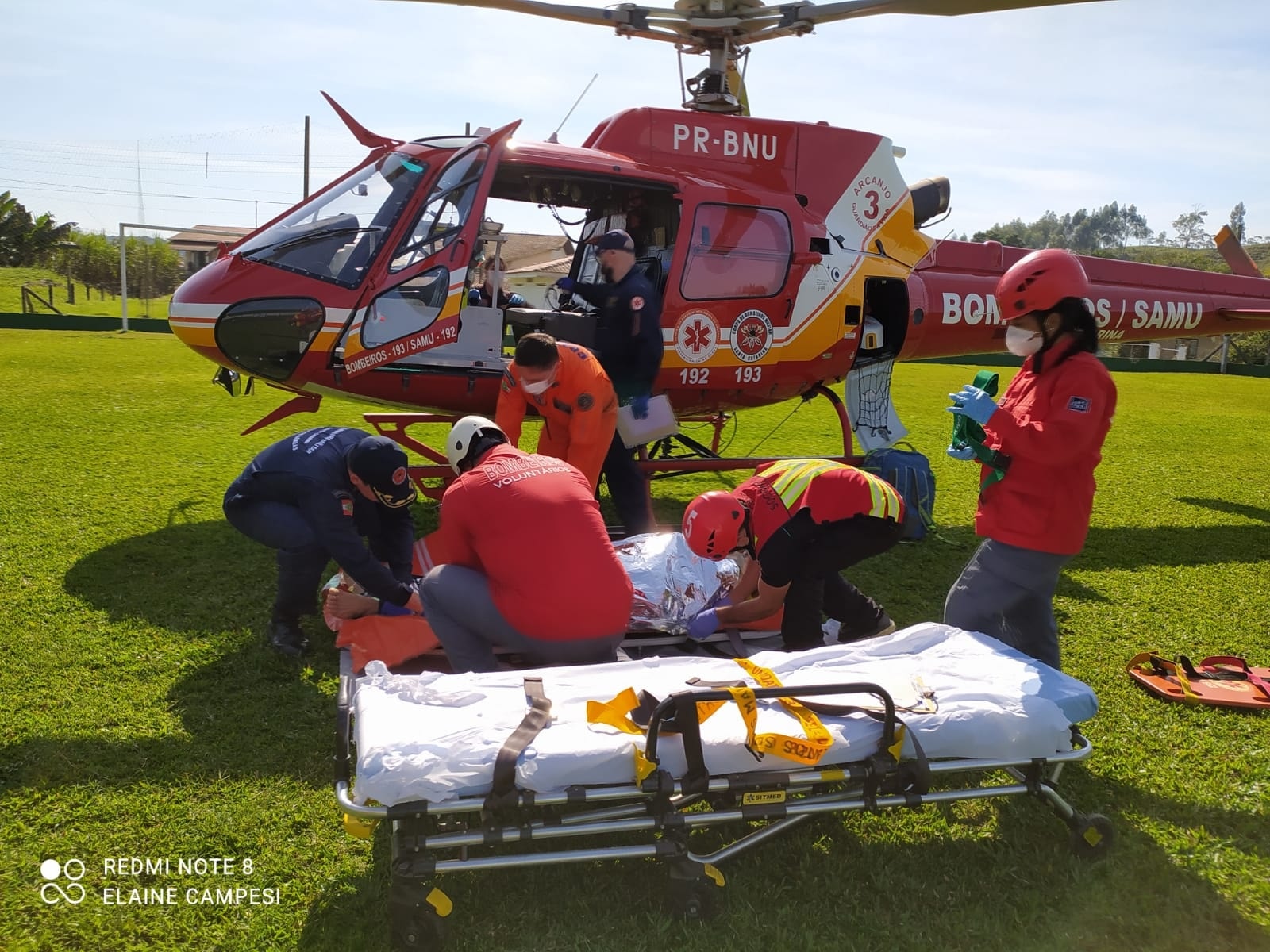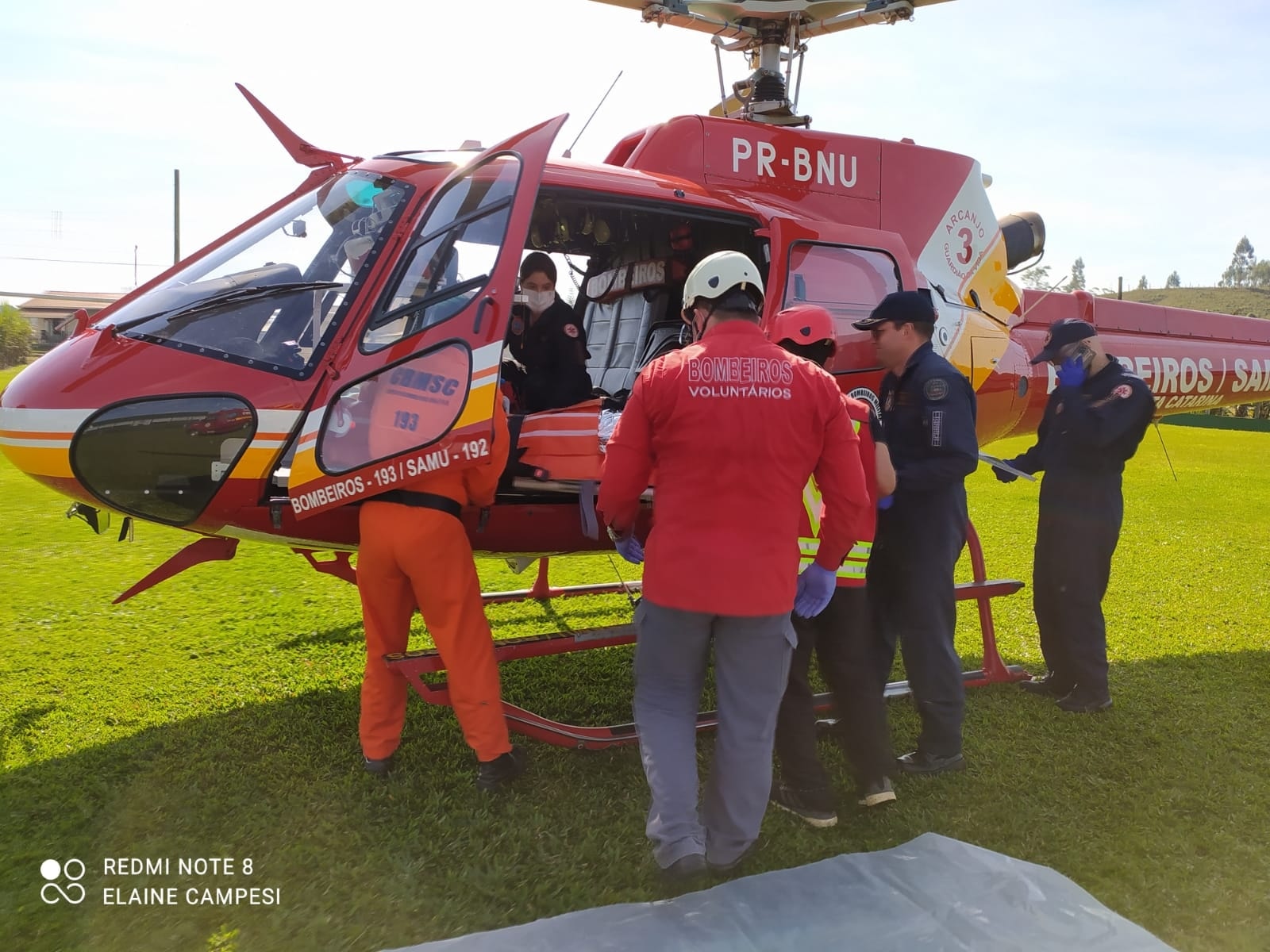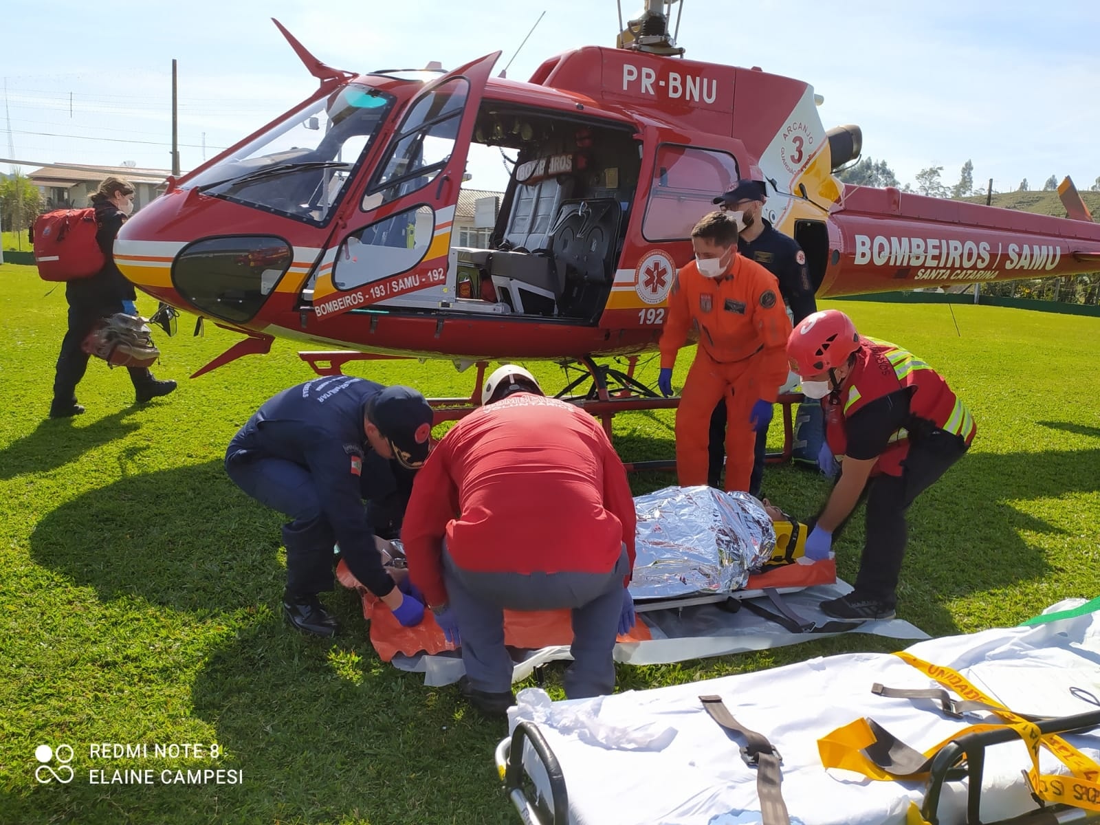 Lá, ele recebeu algumas medicações e, na sequência, foi levado até um campo de futebol ao lado do Centro de Eventos, no Centro da cidade, onde o Helicóptero Arcanjo 3, do Corpo de Bombeiros, já o aguardava para o transportá-lo até o Hospital São José, em Jaraguá do Sul.