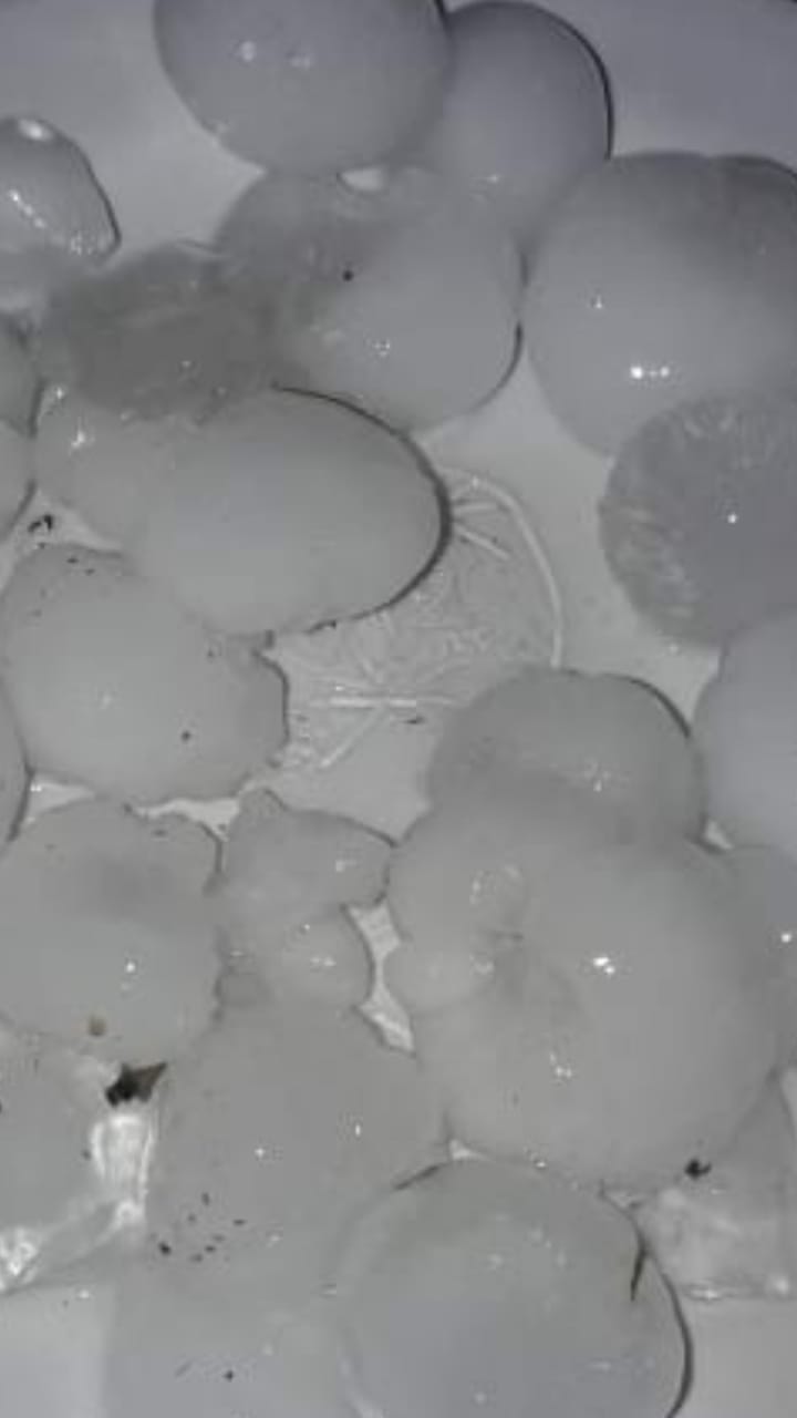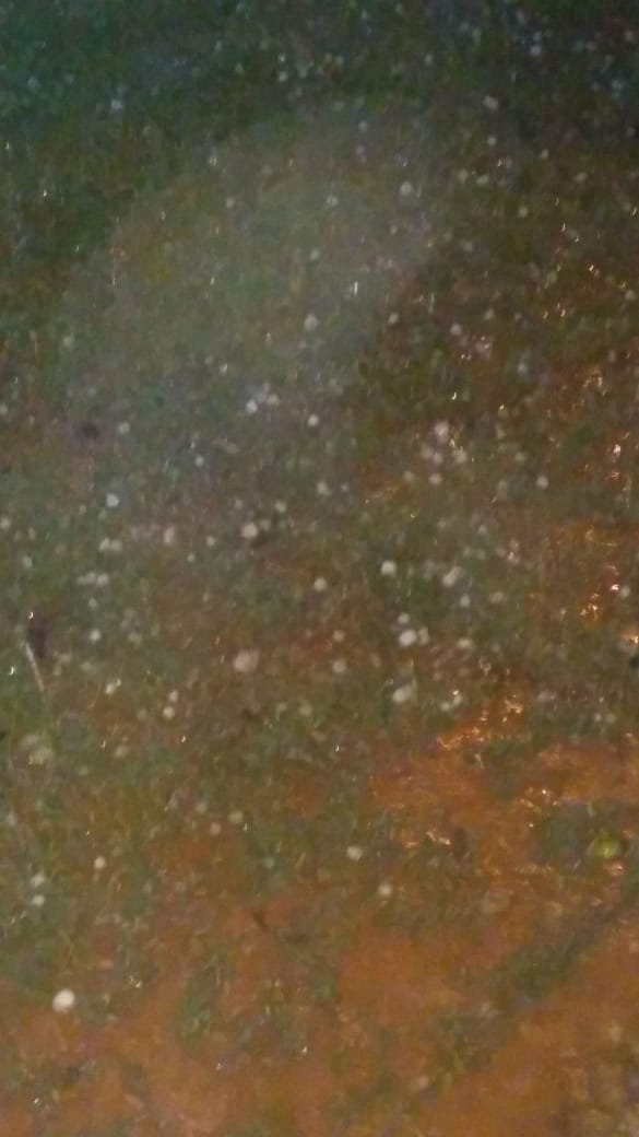 Granizo intenso foi registrado em vários bairros da cidade e nos municípios que compõem a microrregião. As pedras de gelo demonstram tamanho considerável, como pode ser visto em foto de Eberson Teodoro.