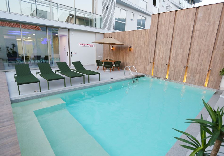 A arquiteta explica que o destaque do Lumina está na sacada com a laje slim, expressando leveza e contemporaneidade em um empreendimento projetado para oferecer a vista panorâmica de Jaraguá do Sul. Além disso, os grandes vãos de abertura favorecem a ventilação e a luminosidade natural.