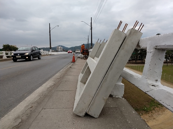 O “rebaixo” que havia no asfalto da rodovia foi recapeado e as peças em concreto para a nova mureta de proteção já estão no local. Há exatamente um ano, sucessivos acidentes naquele trecho resultaram nos danos causados à estrutura, que posteriormente recebeu uma tela e ripas de madeira.