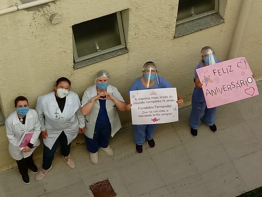 Pela janela de seu quarto, Fernanda pode ouvir o canto de parabéns à você e ver a homenagem prestada pela equipe que ajuda em sua recuperação; porém, pela janela. “Preparamos uma pequena homenagem, mas com muito amor. Entendemos que toda jovem gostaria de viver seus 15 anos, por isso tivemos a ideia de produzir este momento. Ela está em uma área de isolamento, mas, mesmo assim, não poderíamos deixar passar em branco. Então a equipe multidisciplinar da oncopediatria se reuniu para confeccionar cartazes. Trouxemos balões e um café da tarde especial para ela. Ela é uma paciente muito querida para nós e como nesse momento de pandemia não podemos abraçar e comemorar junto a ela, tivemos essa ideia para que sinta nosso carinho mesmo de longe”, comenta a enfermeira do setor Thaiana Meyer.