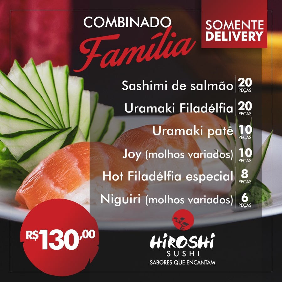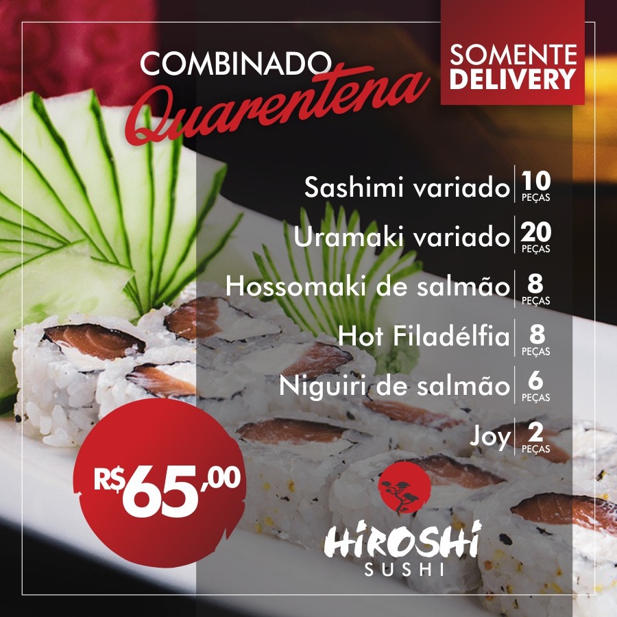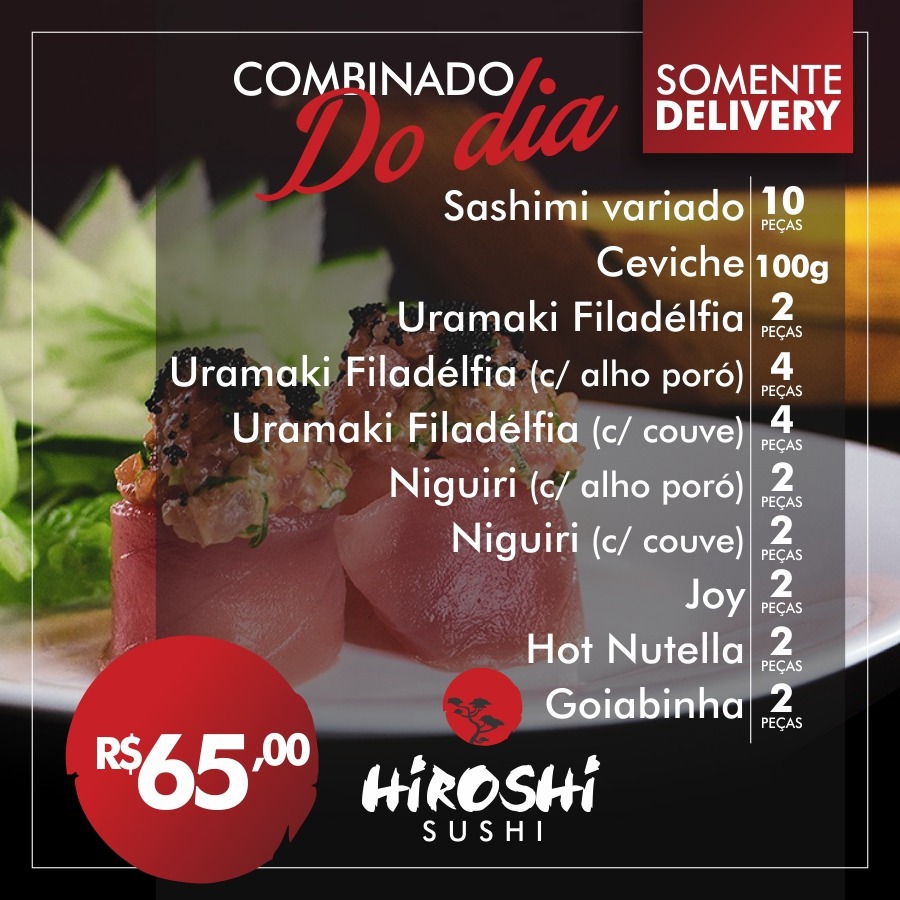 O local serve com fartura e sabor inigualável através de combinados de sushi preparados com técnicas profissionais da cozinha japonesa. Cada combinado é único e esta variedade permite que o Hiroshi agrade ao gosto de várias pessoas ao mesmo tempo. De acordo com os sushi-mens do local, os favoritos da clientela são o Combinado do Dia, o Combinado Quarentena e o Combinado Família.