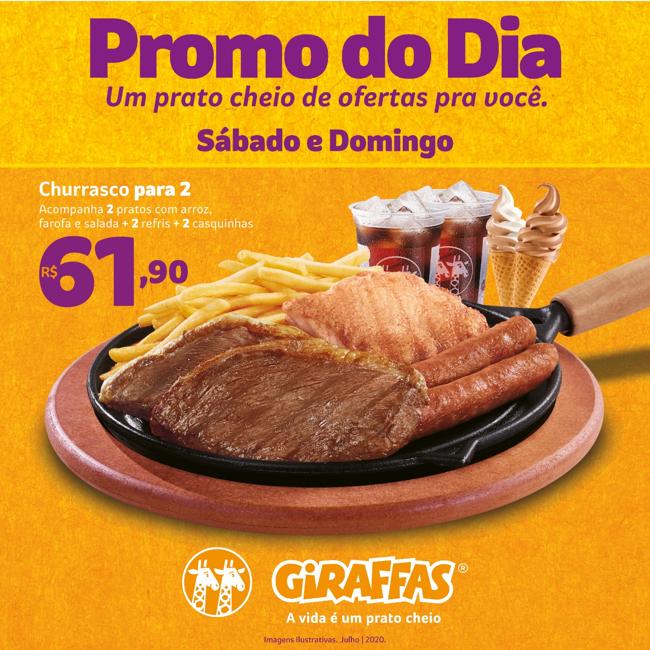 Churrasco para Dois: deliciosos pedaços de picanha, linguiça de pernil. Acompanha ainda dois pratos com arroz, farofa e salada + dois refris + duas casquinhas por R$ 61,90.