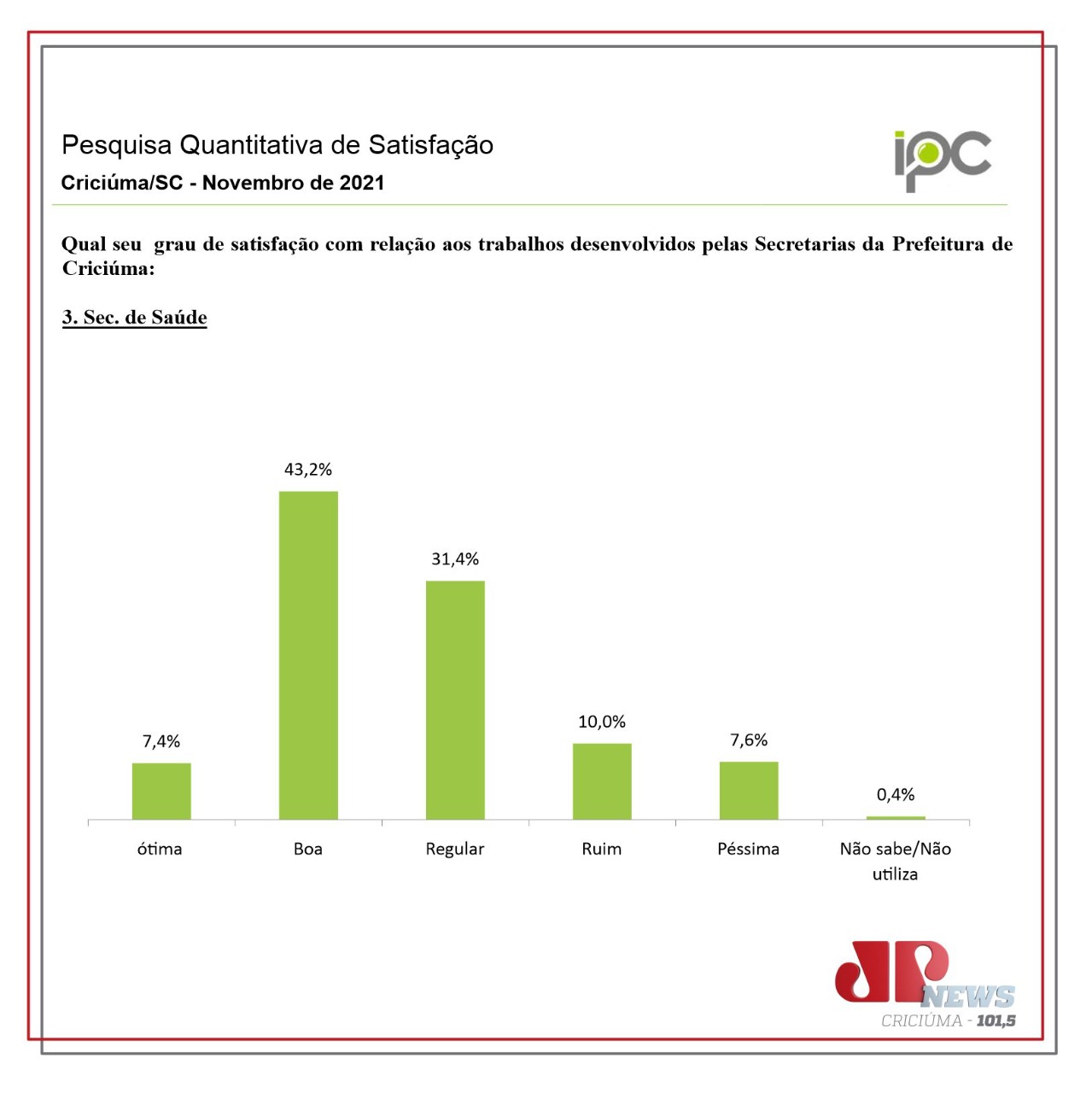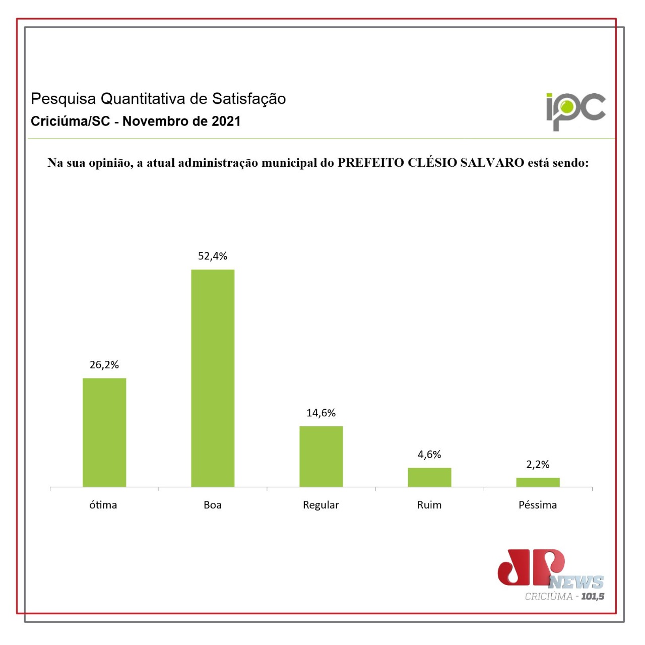 A Rádio Jovem Pan News Criciúma deu início na última semana a divulgação de uma série de pesquisas de avaliação das gestões municipais da Região Carbonífera. O segundo município a conhecer os dados foi Criciúma. O prefeito da cidade, Clésio Salvaro (PSDB), esteve no estúdio da emissora e falou sobre o resultado. O primeiro município a ter os dados divulgados foi Orleans.
