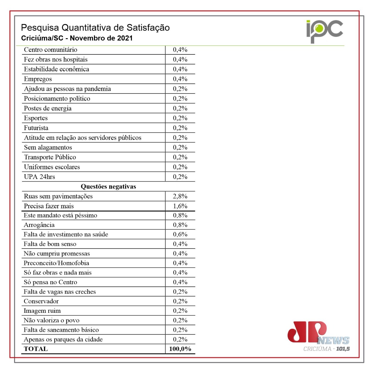 Nas lembranças negativas apontadas são 2,8% dos entrevistados que pedem por mais pavimentação e 1,6% deles dizem que o prefeito precisa ‘fazer mais’ pela cidade.