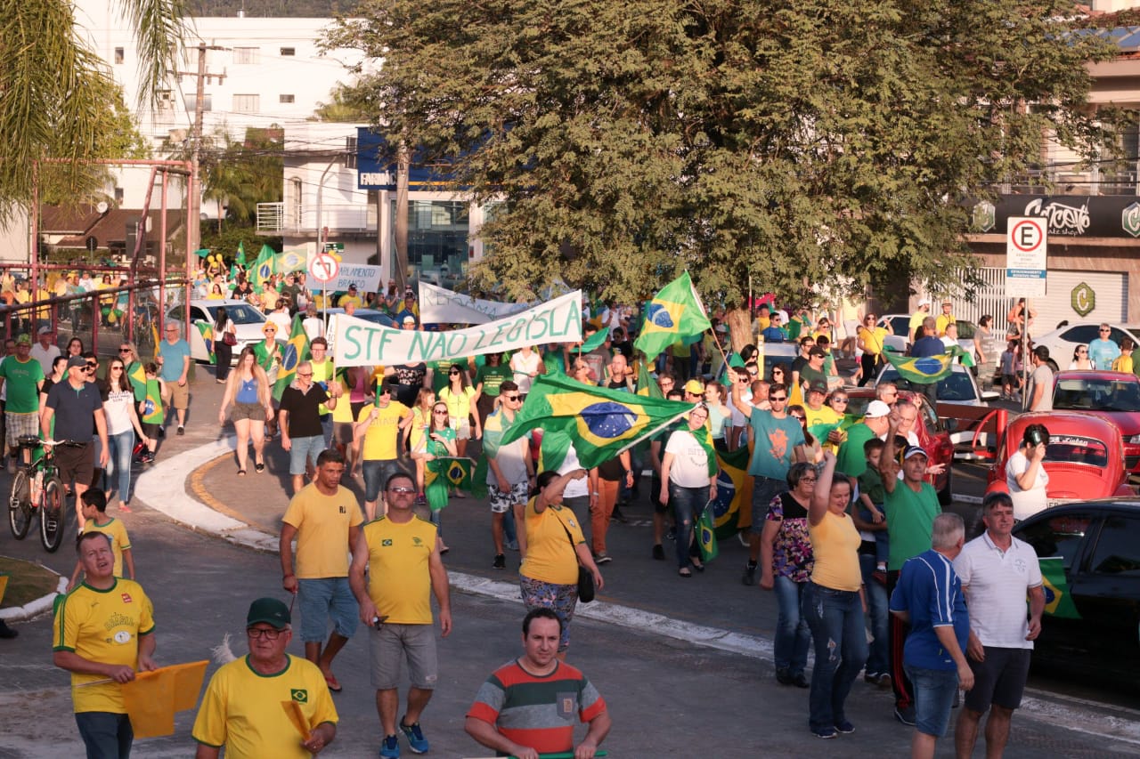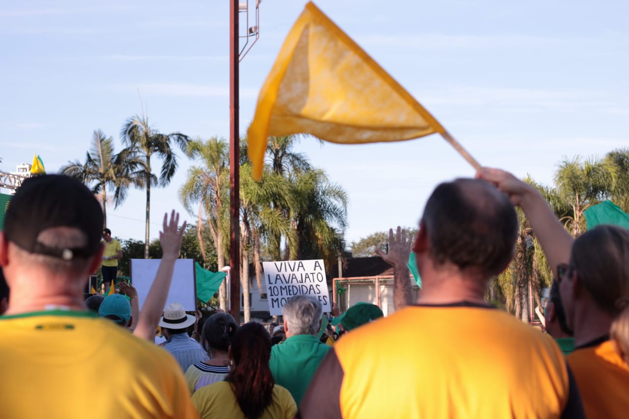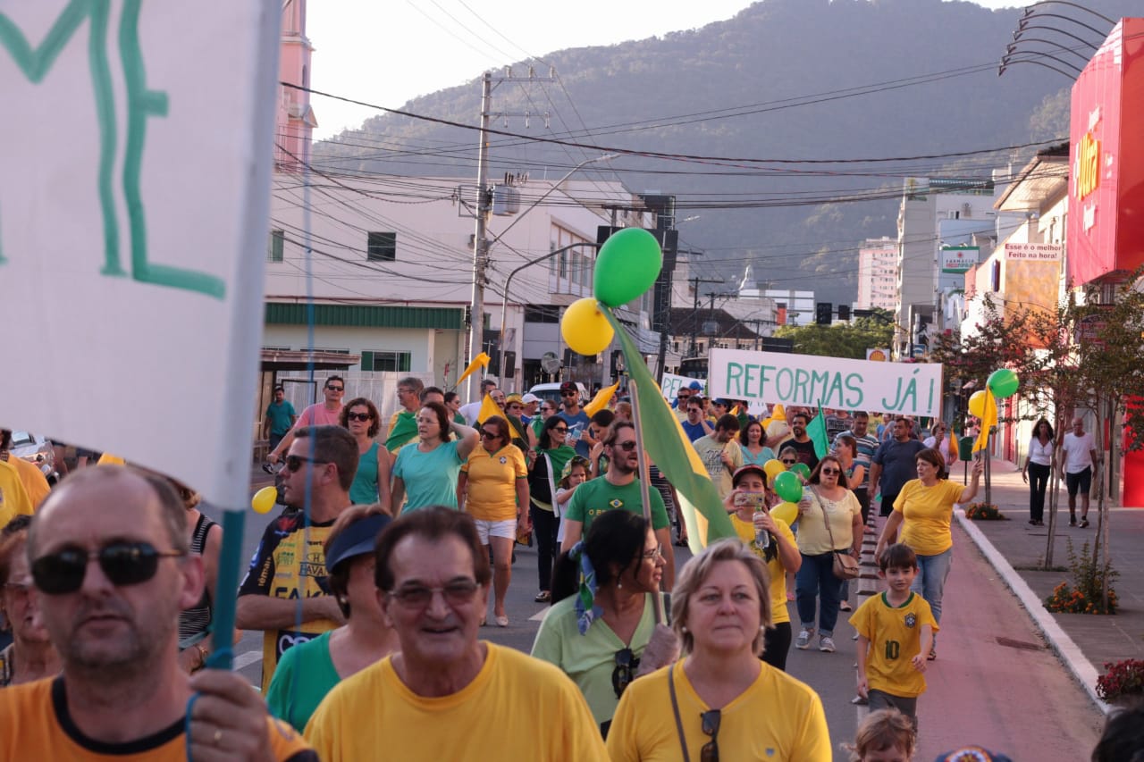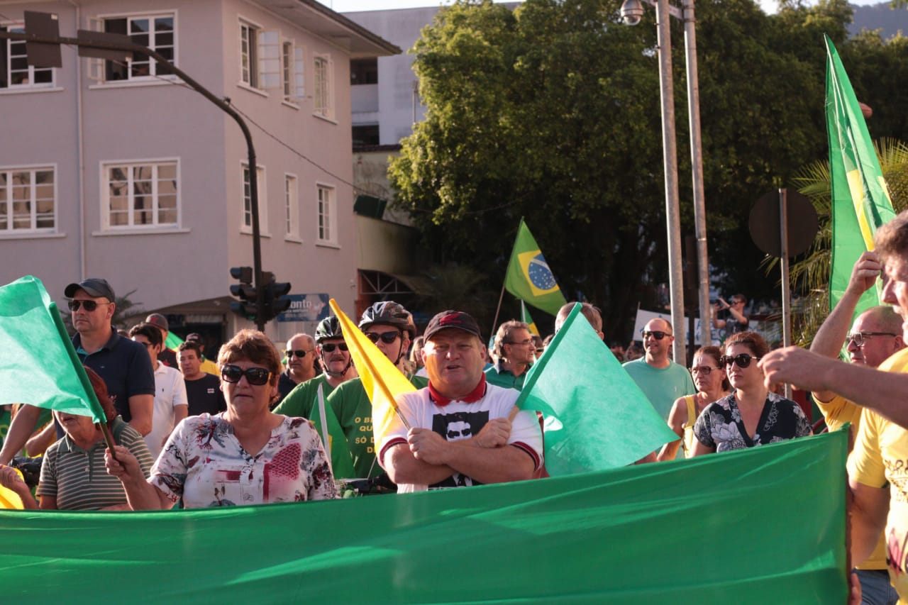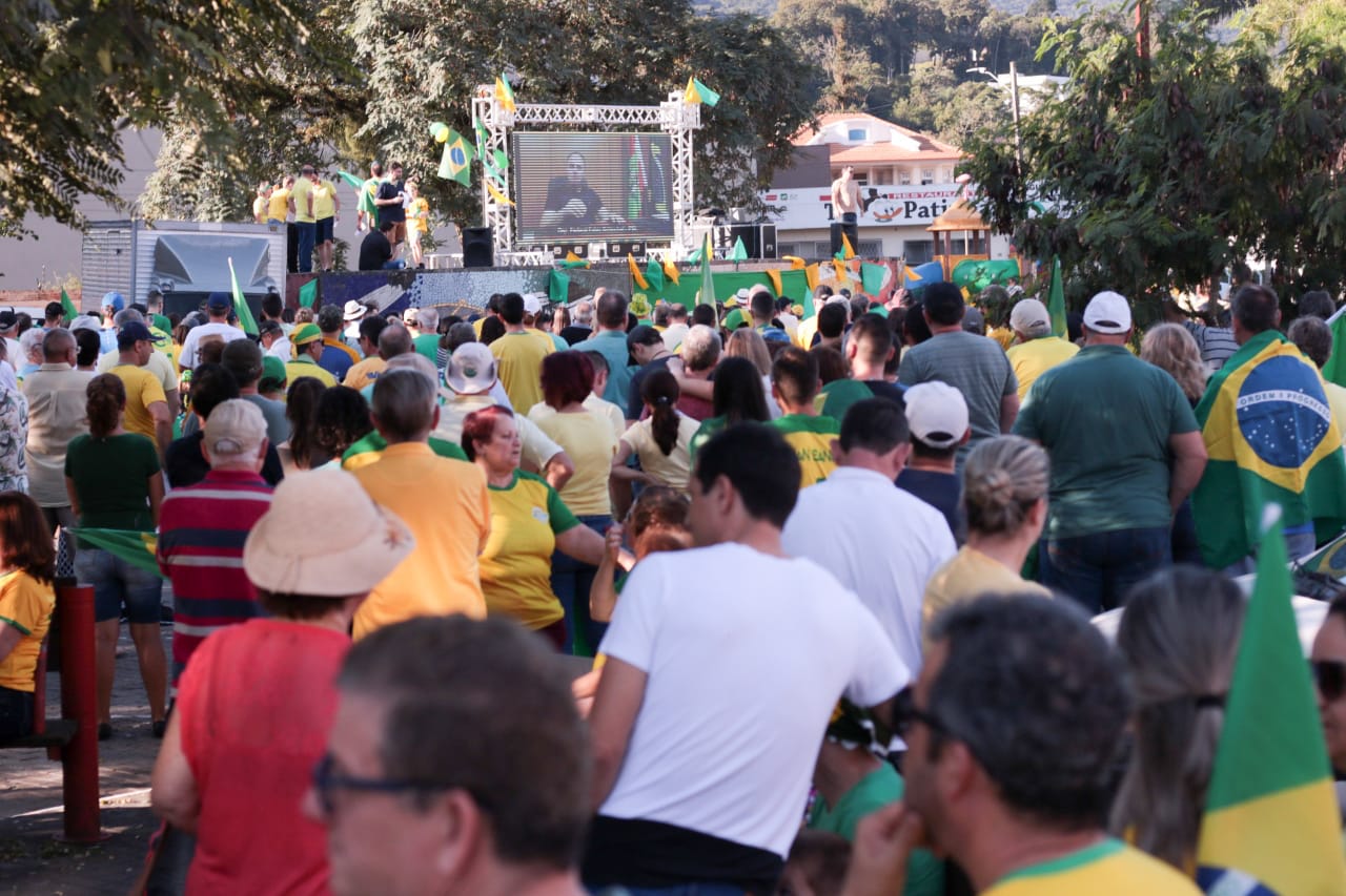 As ruas do Centro de Jaraguá do Sul ficaram lotadas com um colorido de verde e amarelo, neste domingo (30). Milhares de pessoas aderiam aos chamamentos feitos nas redes sociais pelos movimentos Vem Pra Rua e Brasil Livre e manifestaram apoio ao Governo Bolsonaro, à reforma da Previdência, da Lava Jato e de pacote anticrime pelo Brasil, a Operação Lava Jato, pacote anticrime e ao ministro Sérgio Moro.