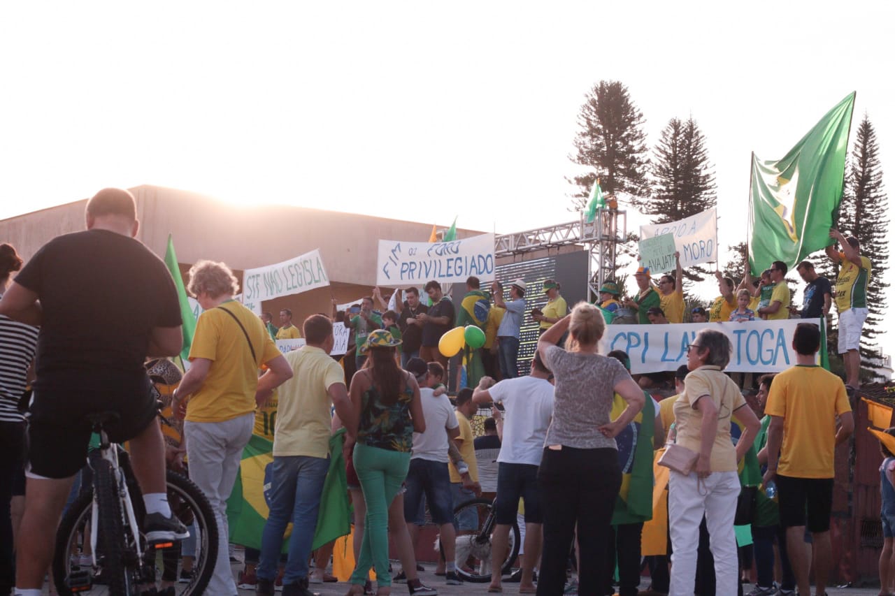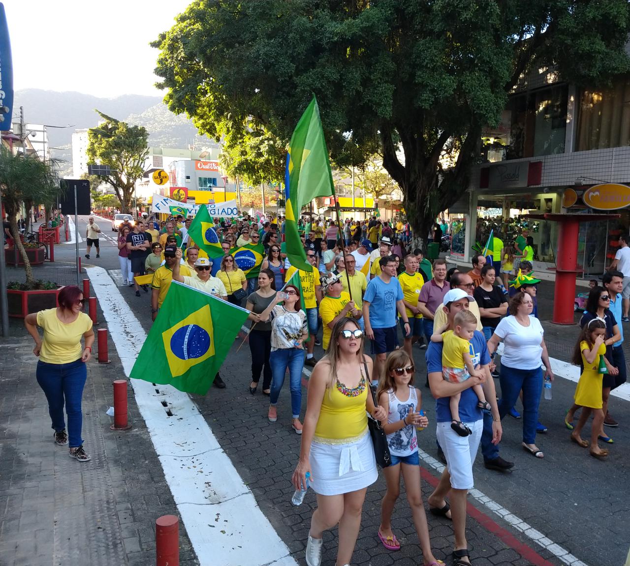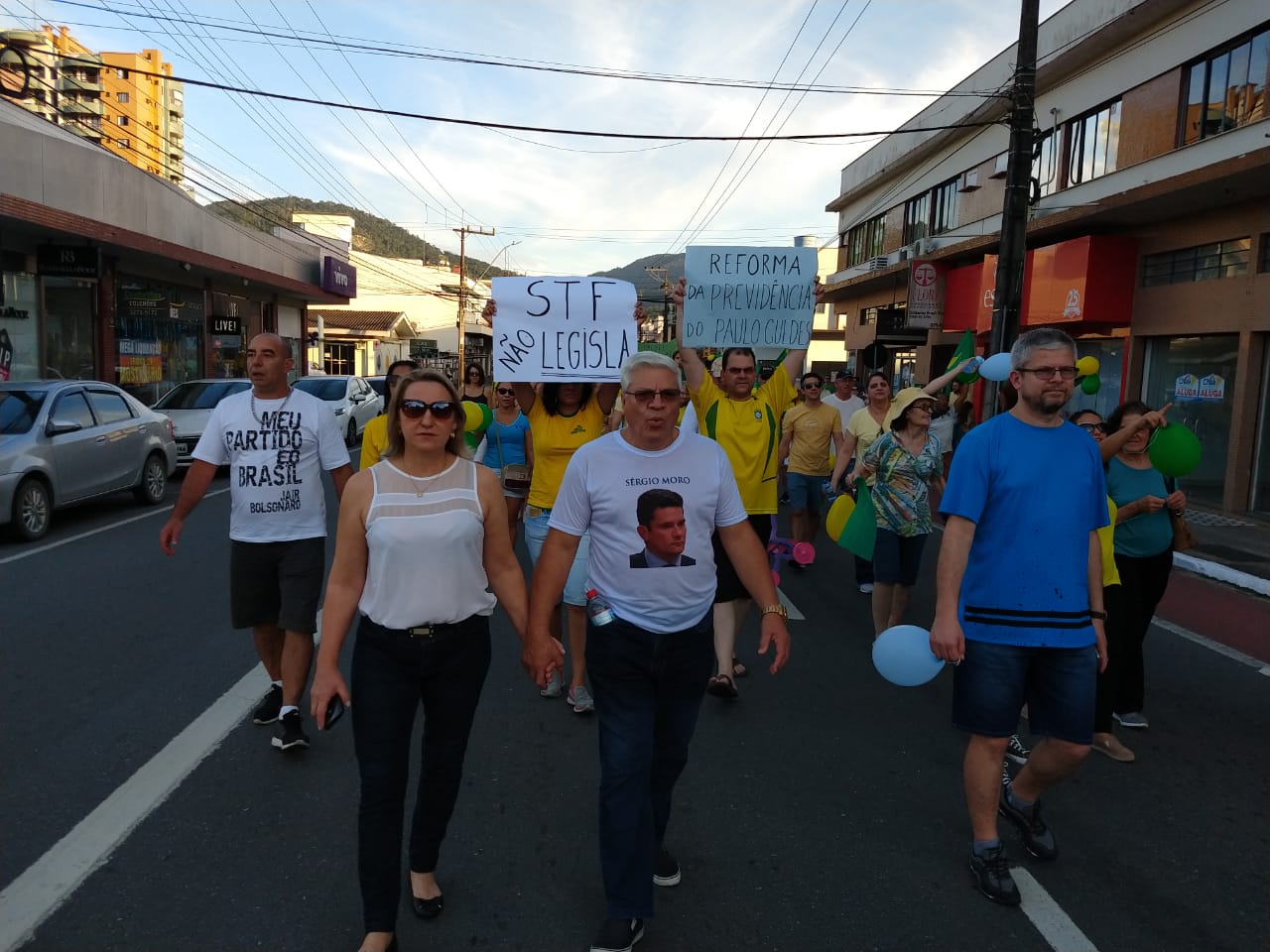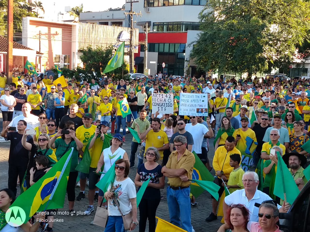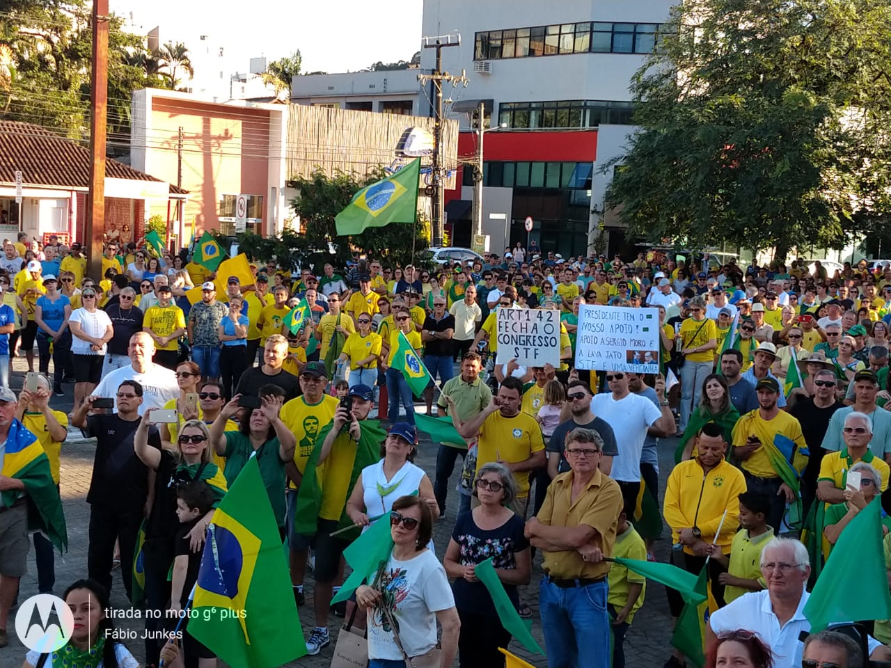 As ruas do Centro de Jaraguá do Sul ficaram lotadas com um colorido de verde e amarelo, neste domingo (30). Milhares de pessoas aderiam aos chamamentos feitos nas redes sociais pelos movimentos Vem Pra Rua e Brasil Livre e manifestaram apoio ao Governo Bolsonaro, à reforma da Previdência, da Lava Jato e de pacote anticrime pelo Brasil, a Operação Lava Jato, pacote anticrime e ao ministro Sérgio Moro.