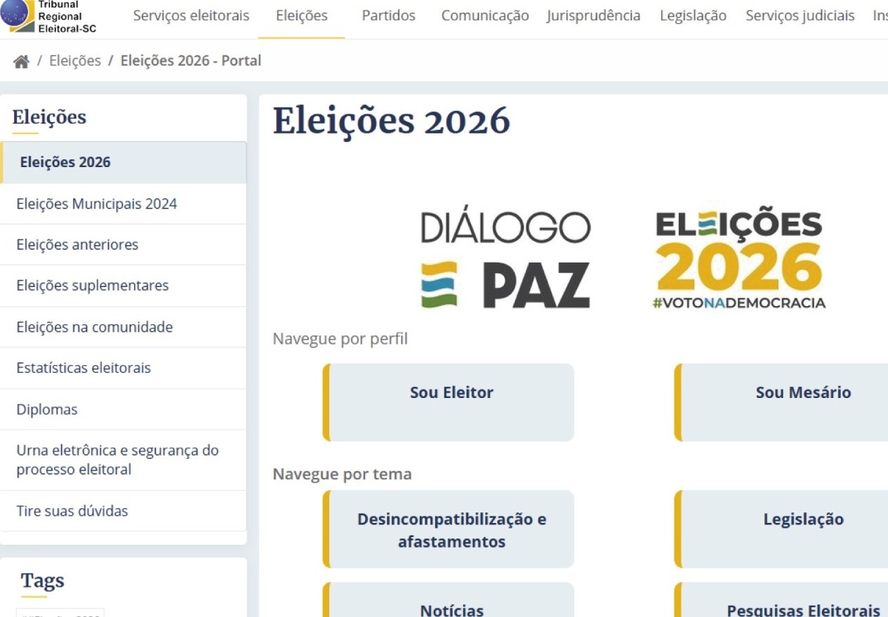Como ocorre em todas as eleições, a criação desse espaço digital reúne as principais informações sobre o pleito do ano. O Portal Eleições 2026 do TRE-SC está organizado em três eixos principais. O primeiro é o da navegação por perfil, que redireciona a pessoa ao autoatendimento eleitoral, destinado ao eleitor, ou ao portal do mesário.