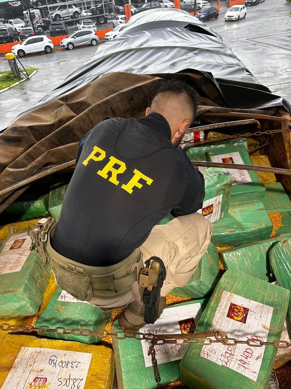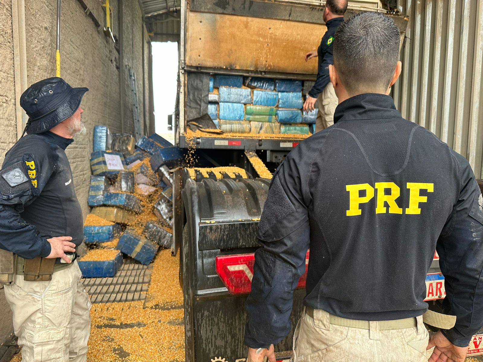 Diante das suspeitas, os PRFs resolveram inspecionar a carga de milho a granel, e logo encontraram vários pacotes escondidos sob os grãos.