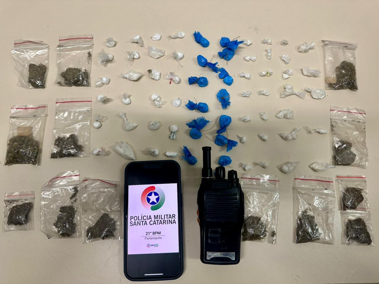 A operação resultou ainda na prisão de um homem flagrado realizando o tráfico de drogas. Com ele, os policiais apreenderam 13 porções de maconha, 50 pedras de crack, 13 petecas de cocaína e um rádio comunicador.