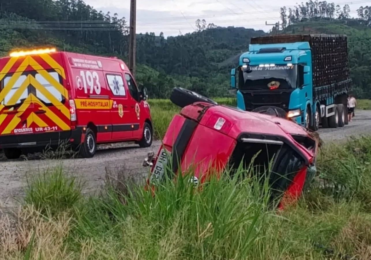 Os Bombeiros Voluntários do município foram acionados após um usuário da rodovia comparecer ao quartel informando sobre um capotamento seguido de atropelamento na Rua Arlindo Quintino Corrêa, conhecida como “Faixa Azul”.