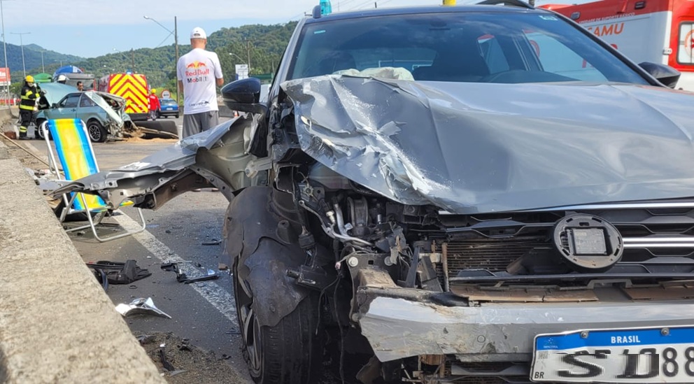 Um acidente grave envolvendo dois carros interditou a BR-280, em Guaramirim, na manhã deste sábado (7), em frente ao Komprão.