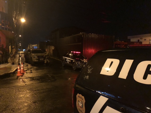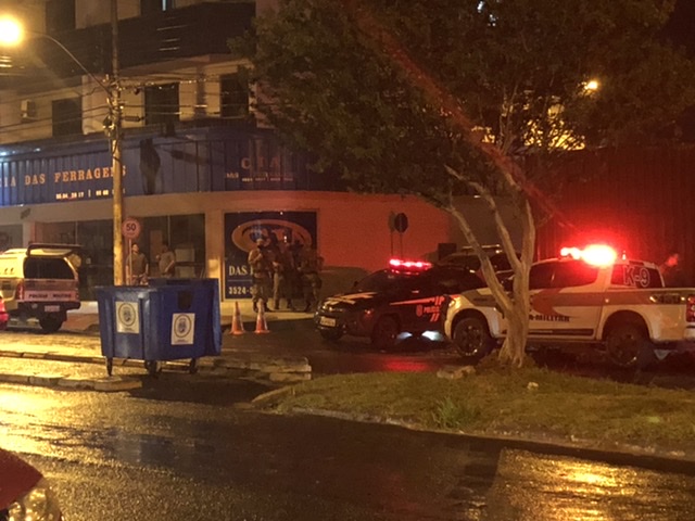 As ruas do entorno da Central de Polícia de Araranguá são iluminadas, na madrugada desta quinta-feira, pelas luzes dos giroflex.