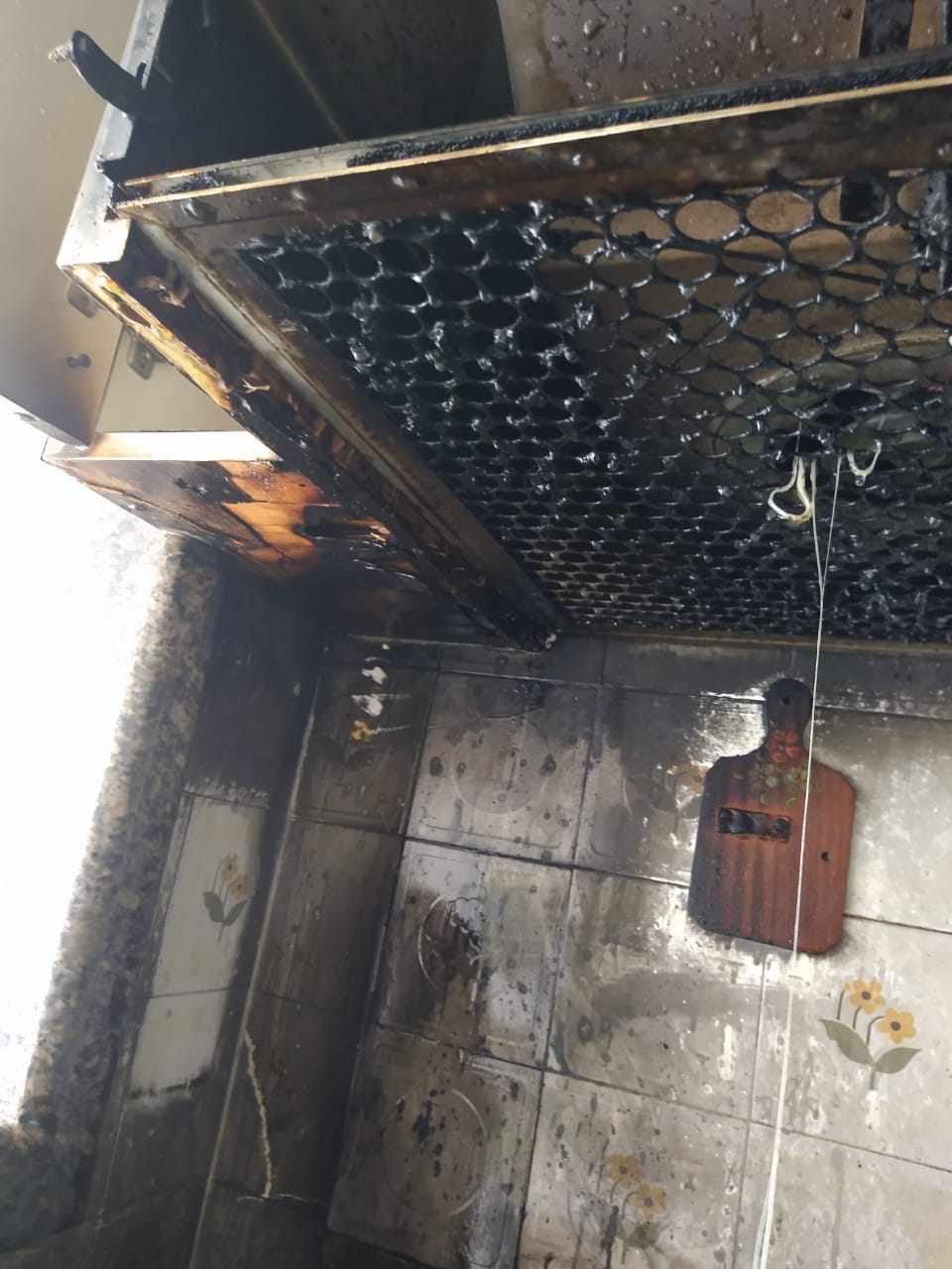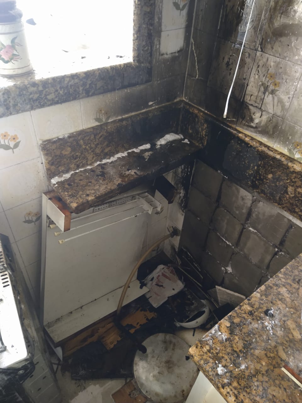 Em seguida, o bombeiro comunitário entregou o extintor de pó químico seco do sistema preventivo contra incêndio da edificação ao cabo, que entrou na cozinha e, juntamente com o bombeiro comunitário Canuto, efetuou o combate ao incêndio que estava concentrado no fogão a gás (forno), depurador, lixeira e no móvel de MDF.