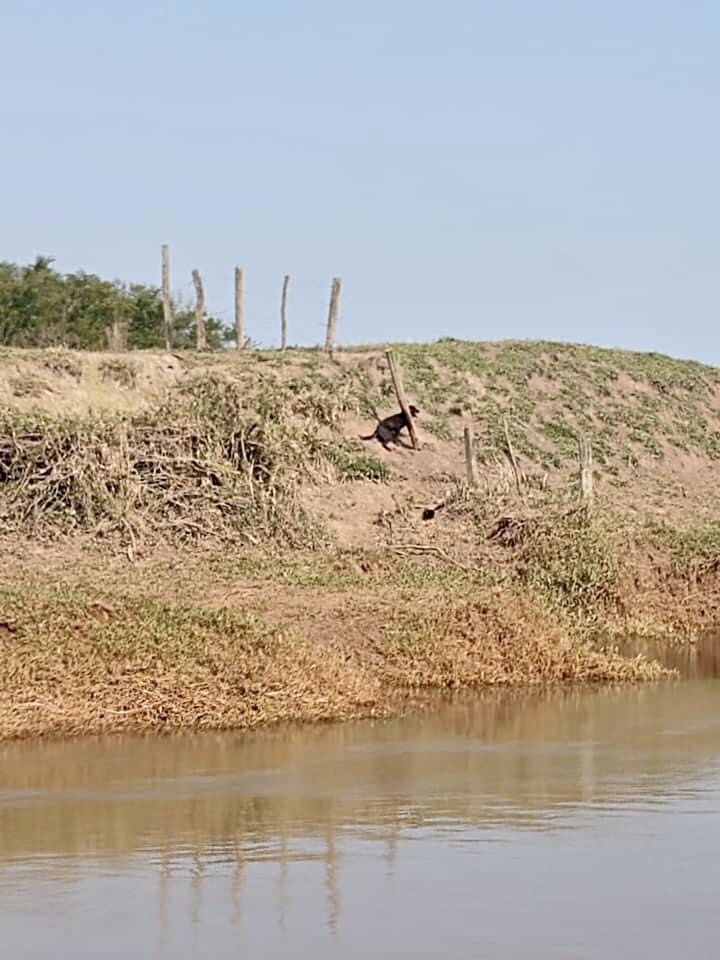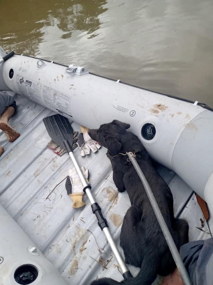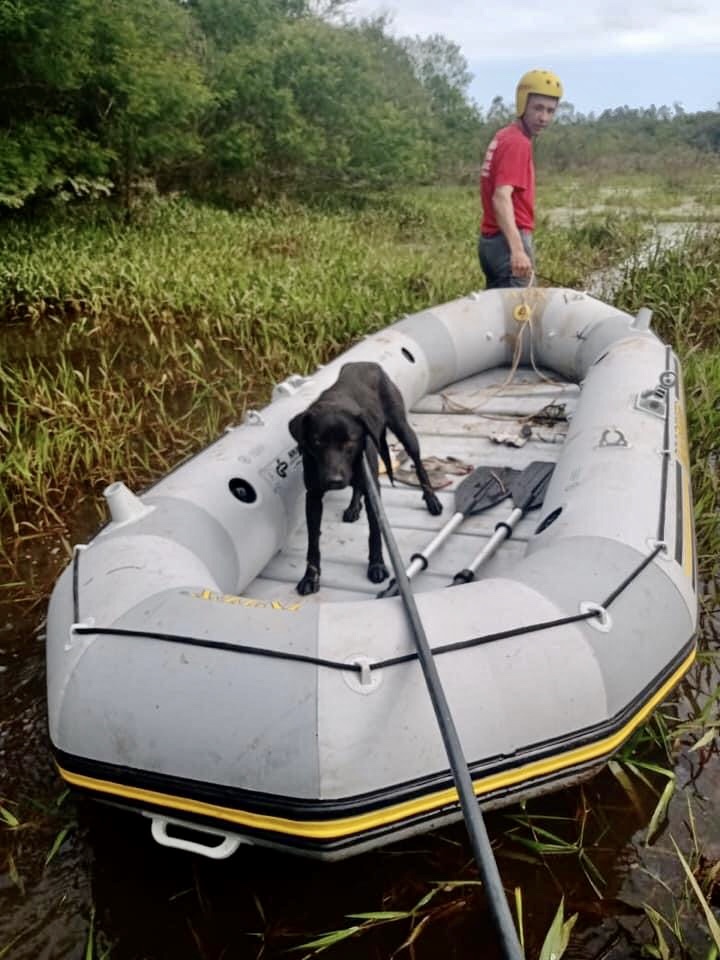 Um trabalhador conseguiu atravessar a área alagada e avistou, no outro lado do rio, um cão preso em uma cerca de arame.