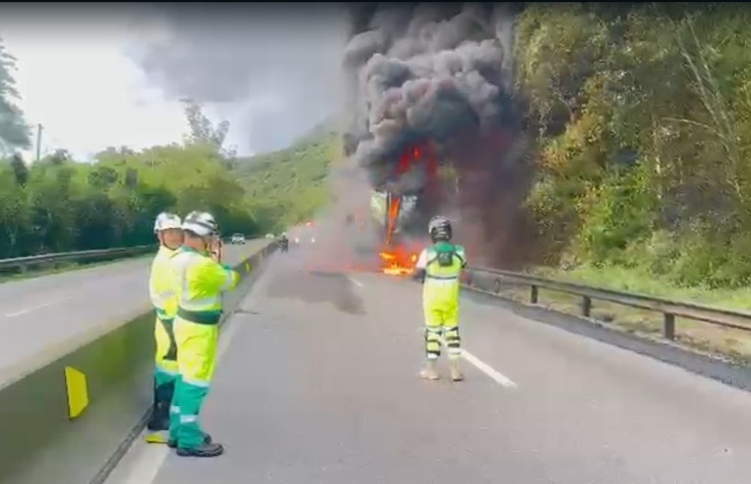 Equipes da concessionária responsável pela rodovia, do Corpo de Bombeiros e da Polícia Rodoviária Federal (PRF) atuam no local no combate ao incêndio, no atendimento da ocorrência e na sinalização da via. Até o momento, não há previsão para a liberação do tráfego.
