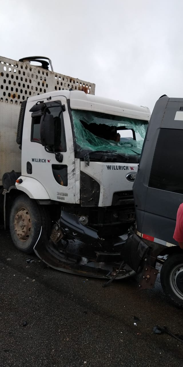 A pista no sentido Sul da BR-101 na altura de Itajaí, ficou interditada na manhã desta sexta-feira (26), depois que um caminhão carregado de madeira bateu na traseira de uma van e prensou o veículo contra outro caminhão.