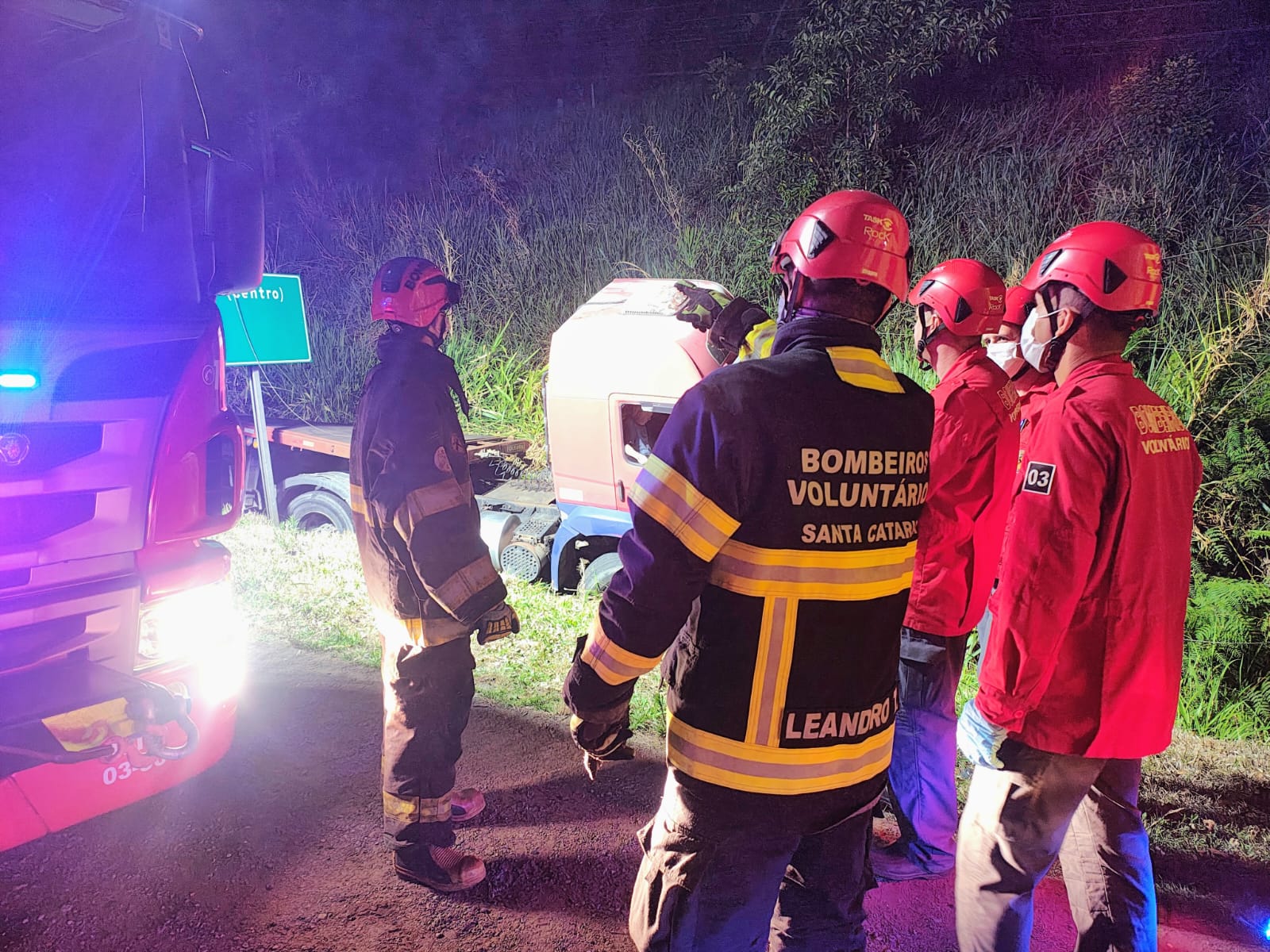 No local, as equipes dos bombeiros aguardam a chegada da Celesc, já que há fiação elétrica sobre o caminhão, o que impede a retirada imediata do motorista por motivos de segurança. A carreta tem placas de Rio Negrinho.
