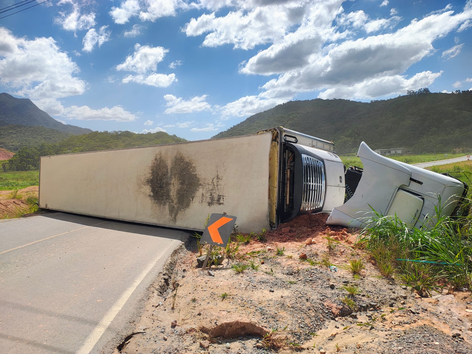 Com o impacto, a carreta — um caminhão-baú — tombou e ficou atravessada na pista, bloqueando os dois sentidos da rodovia. O carro, um Volkswagen Gol, caiu em um barranco às margens da via.