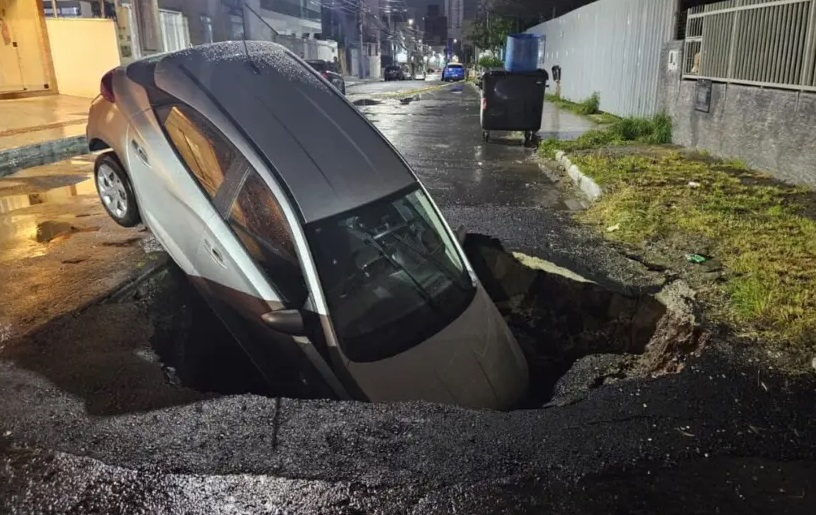 Um carro acabou caindo em uma cratera que se formou em uma rua de Balneário Camboriú após o volume intenso de chuva registrado na noite de segunda-feira, 6 de abril. Apesar do susto, o motorista não se feriu, conforme informou a prefeitura.