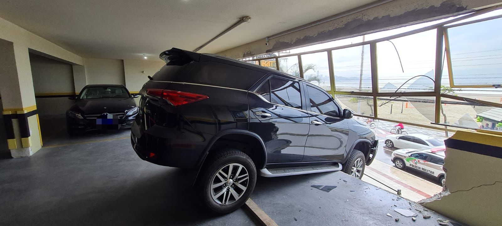 Um carro quebrou a parede de uma garagem em um edifício de Balneário Camboriú, no Litoral Norte catarinense, na manhã deste sábado (9).