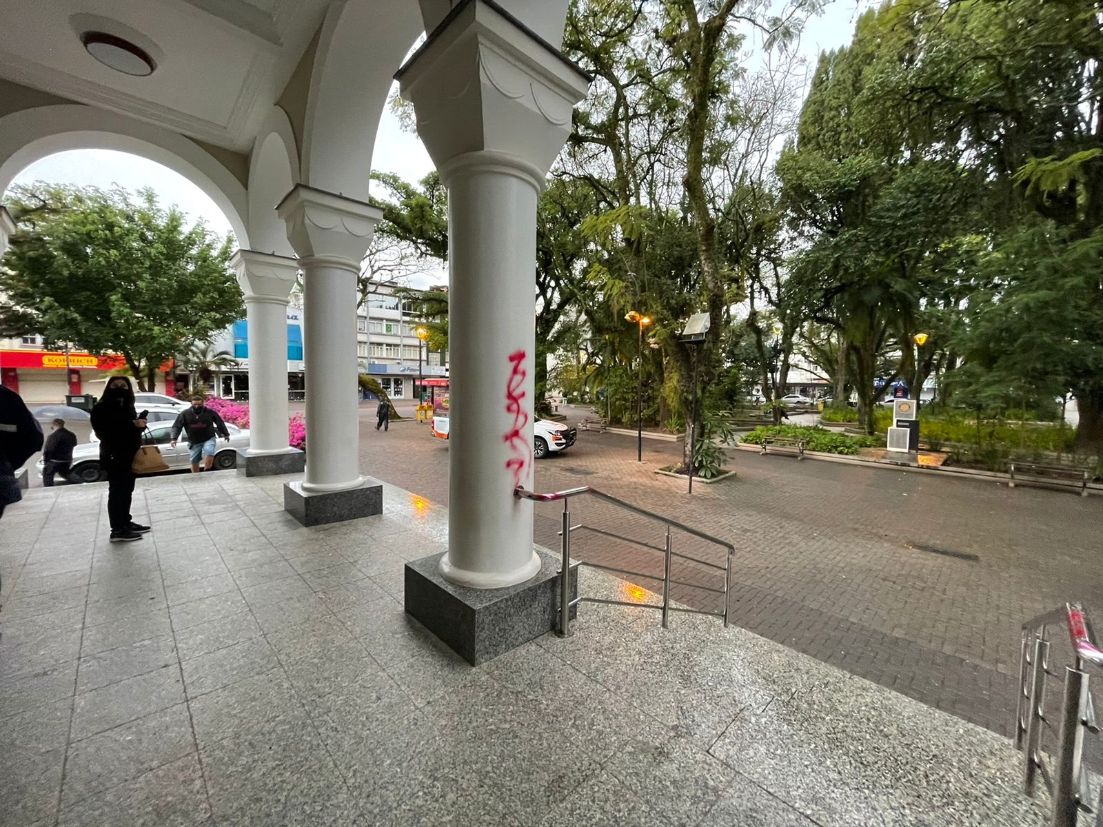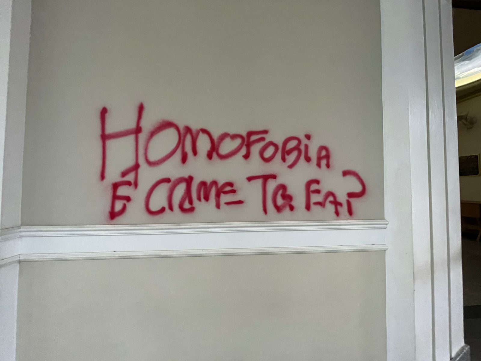 Frases como “homofobia é crime” e “Fora Salvaro” foram pichadas na fachada das igrejas e também do colégio. O descontentamento de algumas pessoas diz respeito ao trecho onde o prefeito utiliza a palavra “viadagem” em seu discurso.