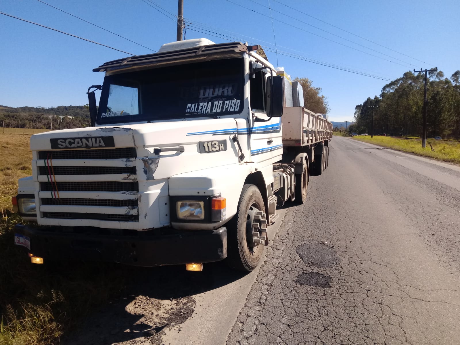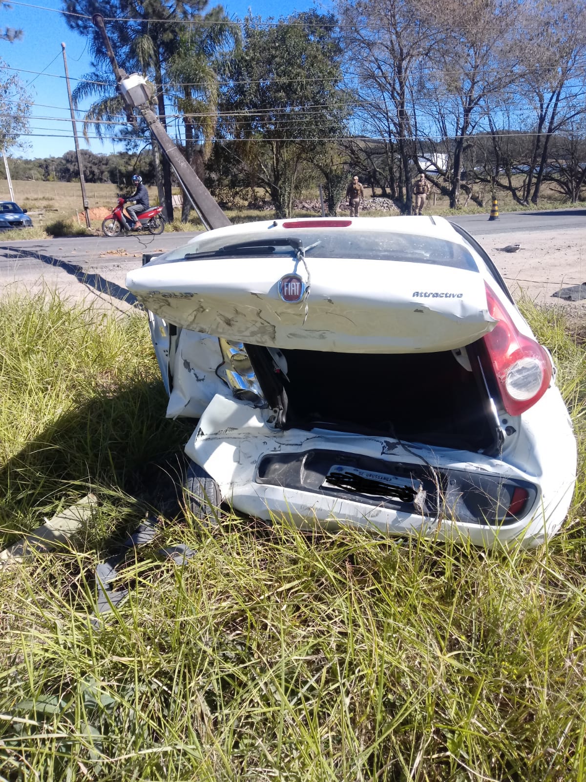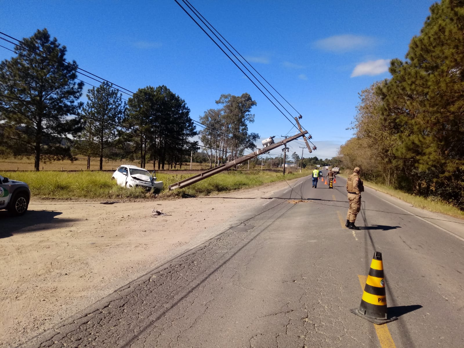 A Polícia Militar e a empresa concessionária de energia estiveram no local pois um poste foi atingido com a colisão e ficou caído sobre a pista.