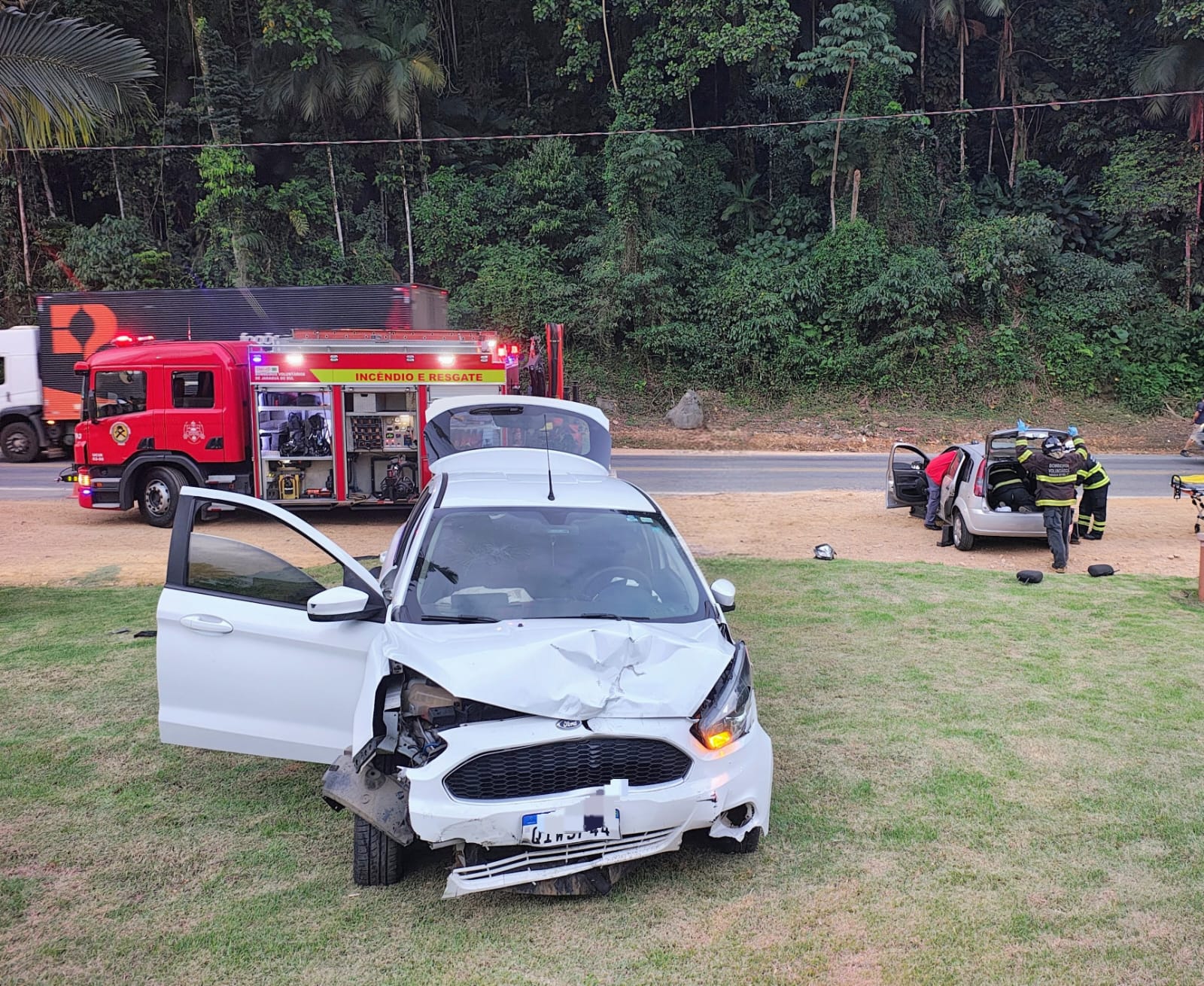 No Ford Fiesta, um casal foi atendido pelos socorristas. O motorista não apresentava ferimentos, enquanto a passageira relatava dor local e foi encaminhada em estado estável ao Hospital São José para avaliação médica.