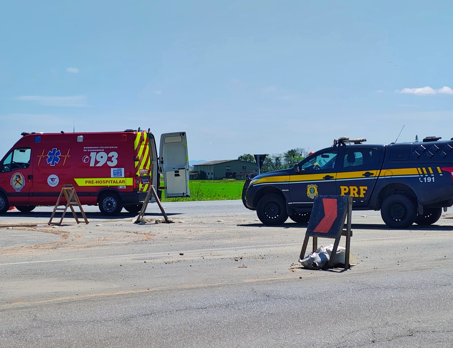 Uma colisão entre uma motocicleta e uma bicicleta deixou dois homens feridos no fim da manhã desta quinta-feira (16) na BR-280, no bairro Imigrantes, em Guaramirim. O acidente foi registrado por volta das 11h10.