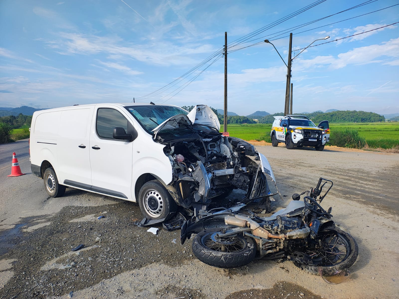 A colisão ocorreu no km 43,6 da rodovia e envolveu um furgão Fiat Scudo, com placas de Massaranduba, e uma motocicleta Royal Enfield Himalayan, registrada em Camboriú. Equipes dos Bombeiros Voluntários foram acionadas e prestaram atendimento no local.