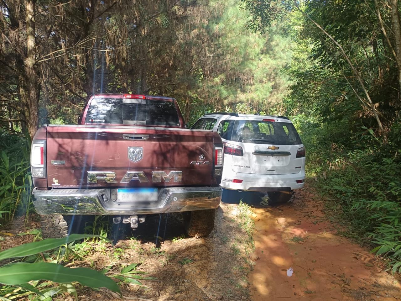 Ao ser questionado, ele disse que teria um ponto de encontro. Uma guarnição do Tático do 1º Batalhão de Pronta Resposta fez uma incursão no local e encontrou uma Nissan Frontier. Mais a frente. Em outra entrada, foram localizados outra Nissan Frontier, uma Ram 2500 e uma Chevrolet Trailblazer. A operação contou com o apoio do helicóptero Águia 7, da 3ª Companhia do Batalhão de Aviação da Polícia Militar.