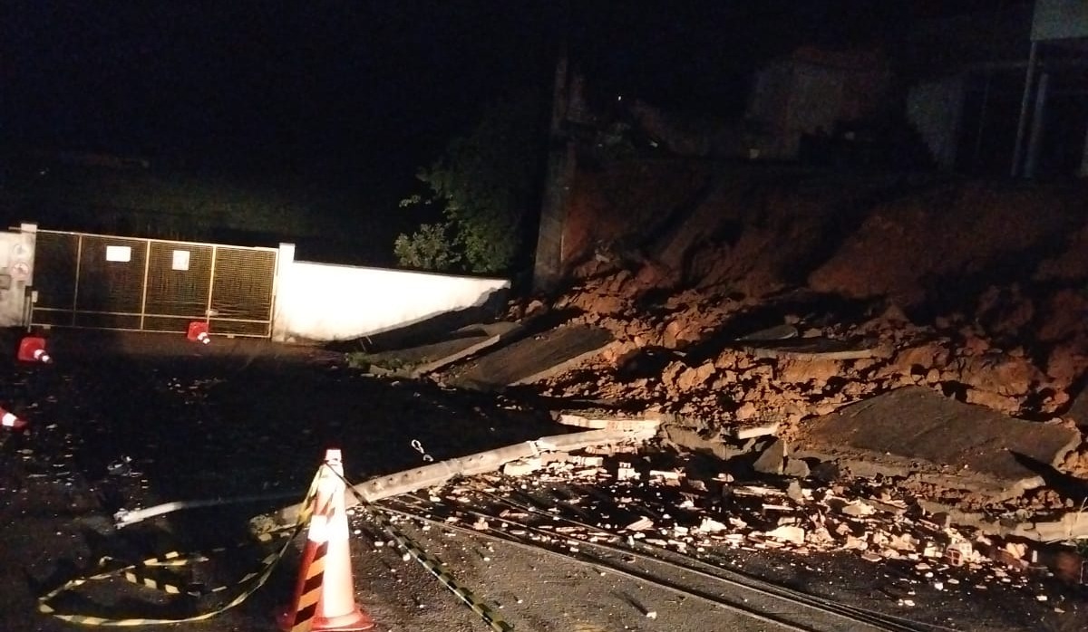 Cerca de duas horas depois, por volta das 22h, parte da estrutura cedeu, provocando o desabamento do muro e o consequente bloqueio da via com terra e entulhos. Apesar do incidente, a residência próxima à estrutura não sofreu danos.