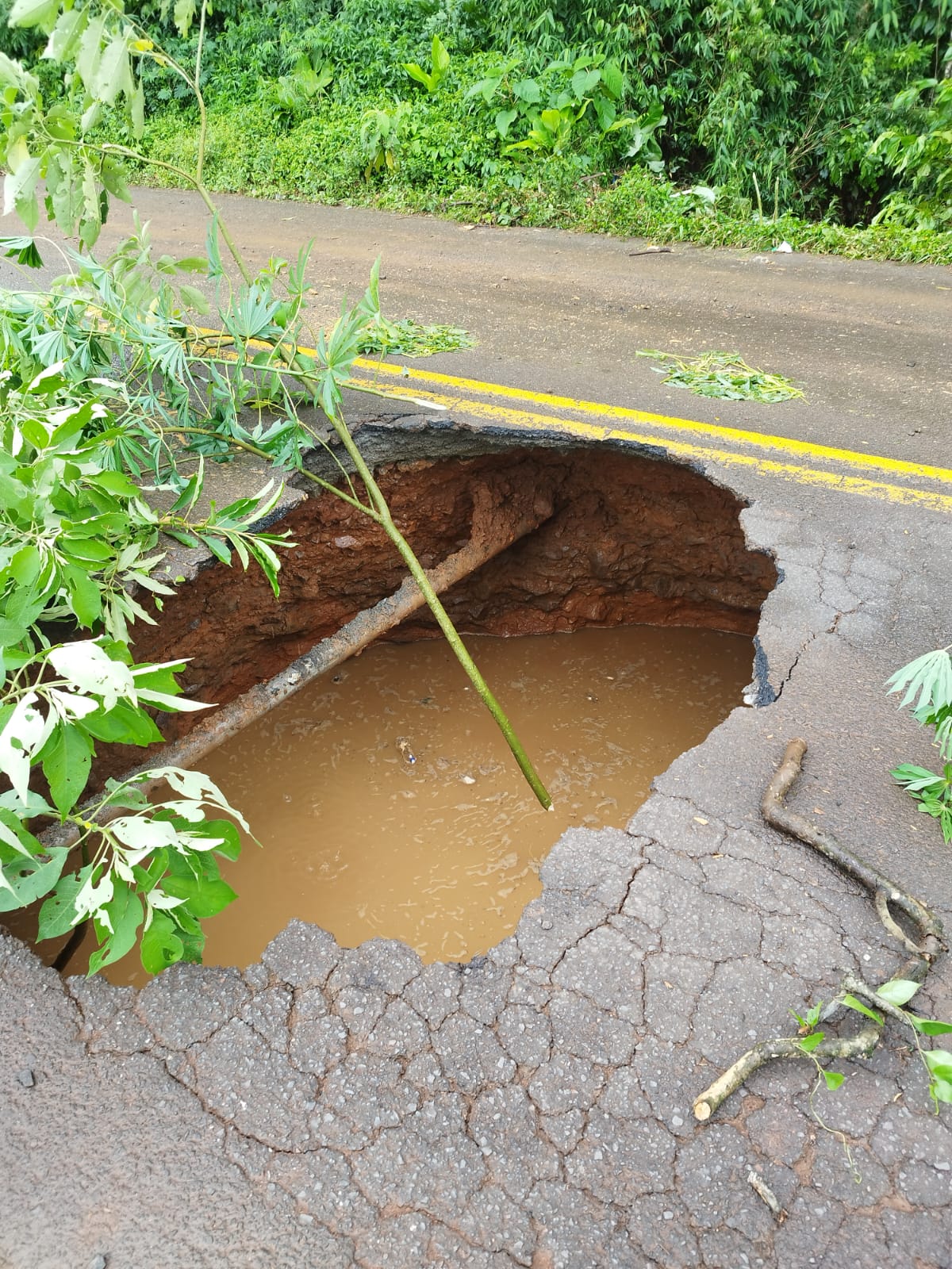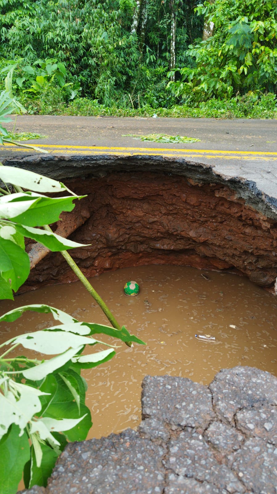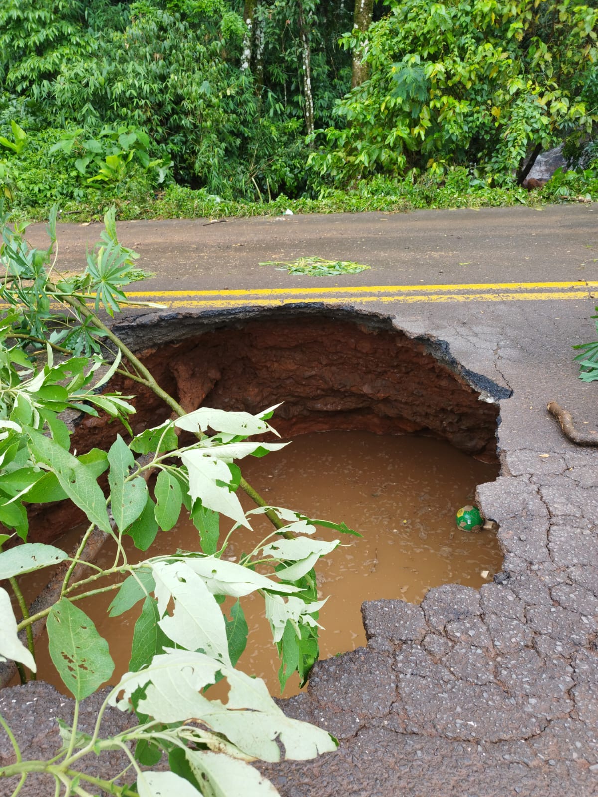 FOTOS: asfalto cede, forma cratera e interdita rodovia em SC