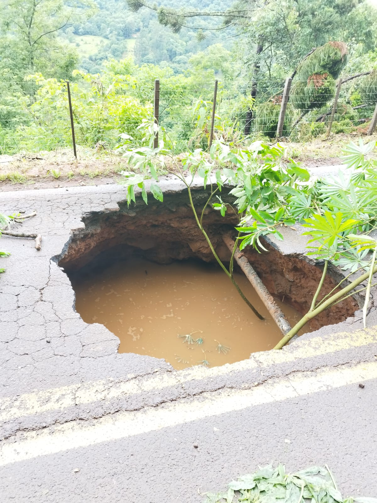 O asfalto da SC-155 cedeu, no início da tarde deste domingo (10), na altura do quilômetro 64 da rodovia, no Oeste catarinense.