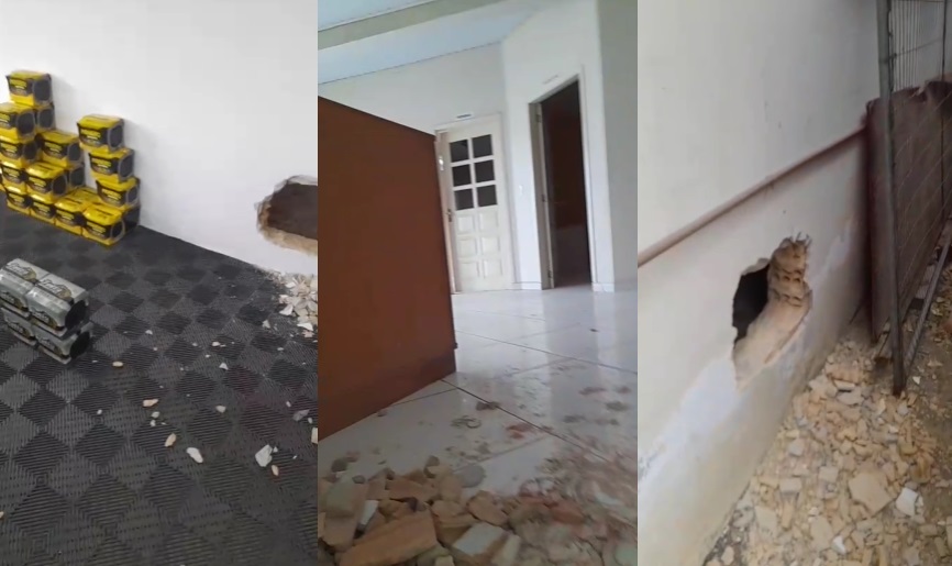 Imagens registradas no local mostram o tamanho do estrago. Os criminosos teriam acessado o interior do estabelecimento por um muro lateral, passando pelo terreno vizinho, e aberto mais de um ponto de entrada até alcançar o interior da loja.