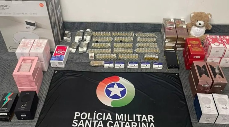 Segundo a Polícia Militar de Santa Catarina, o animal foi decisivo para encontrar os produtos, que estavam em um compartimento oculto de forma premeditada. No carro, os policiais apreenderam dois aspiradores robóticos Xiaomi, um tablet Redmi Pad 2, um smartphone Redmi 15C, 21 perfumes importados e seis maços de cigarro Gudang Garam, todos sem nota fiscal brasileira e oriundos do Paraguai.