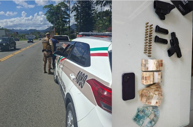 Na busca veicular, foi localizada uma pistola calibre 9 mm municiada, além de outras munições, todas sem a devida guia de tráfego.