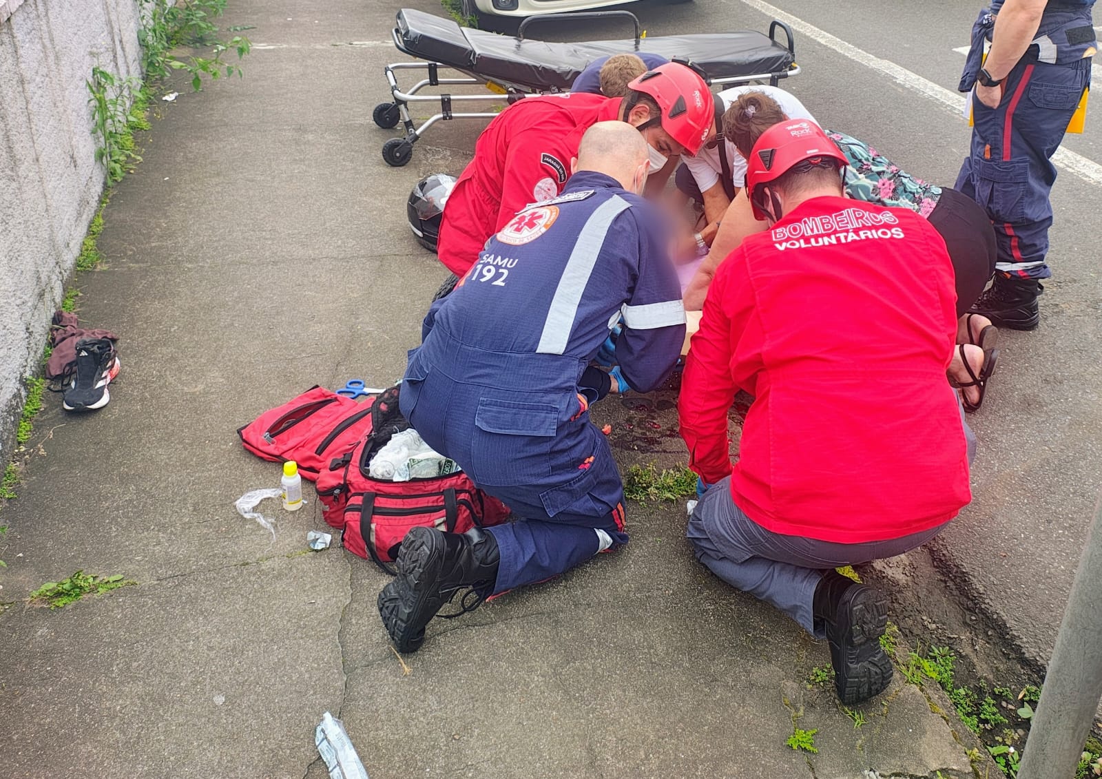 No local, os socorristas encontraram uma mulher de 63 anos caída sobre a calçada, apresentando fratura exposta na perna. Ela foi protocolada e encaminhada ao Hospital São José pelo suporte avançado do SAMU, em estado potencialmente instável.