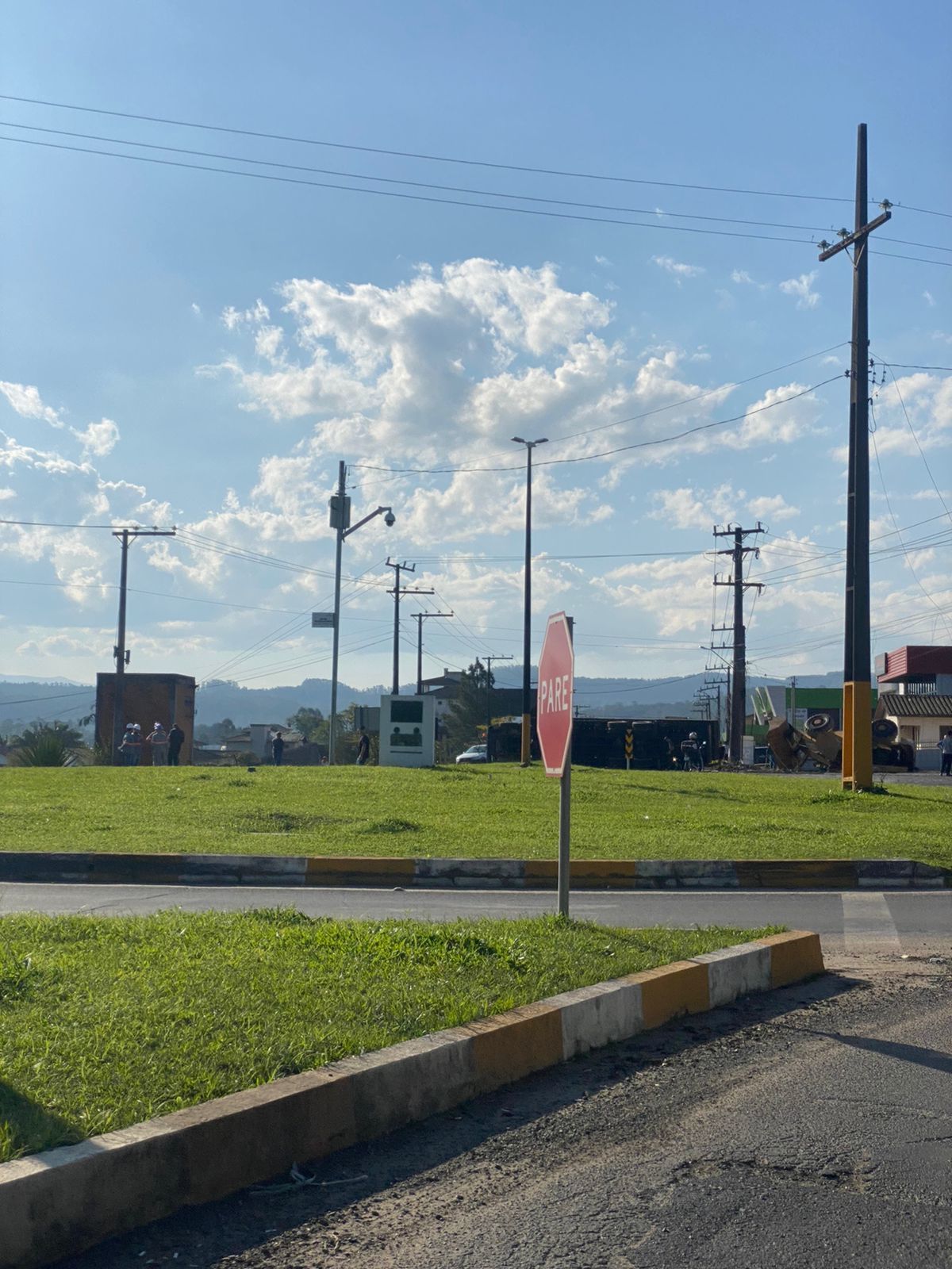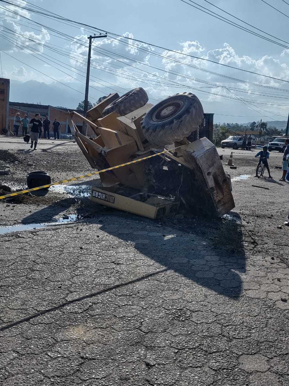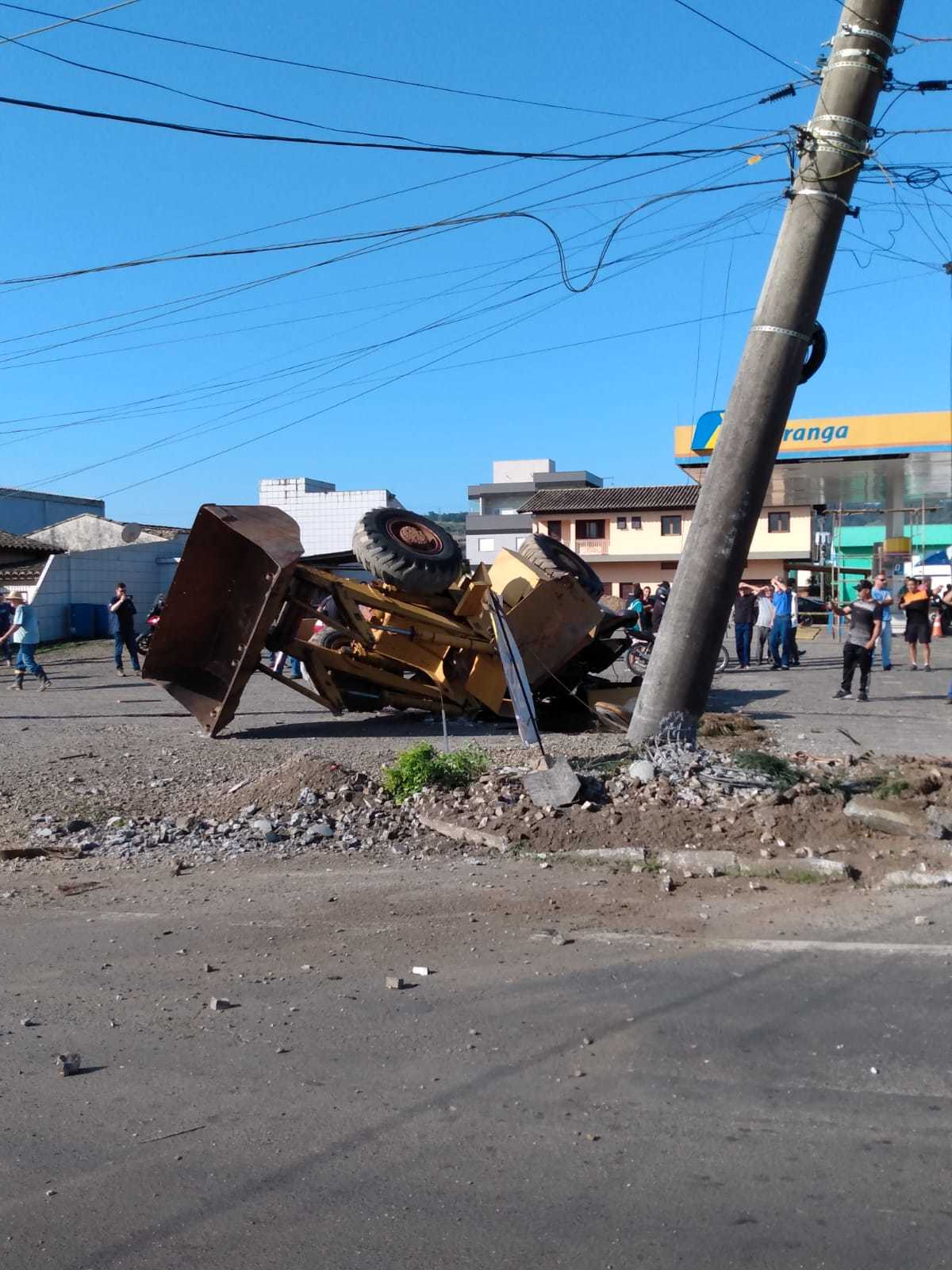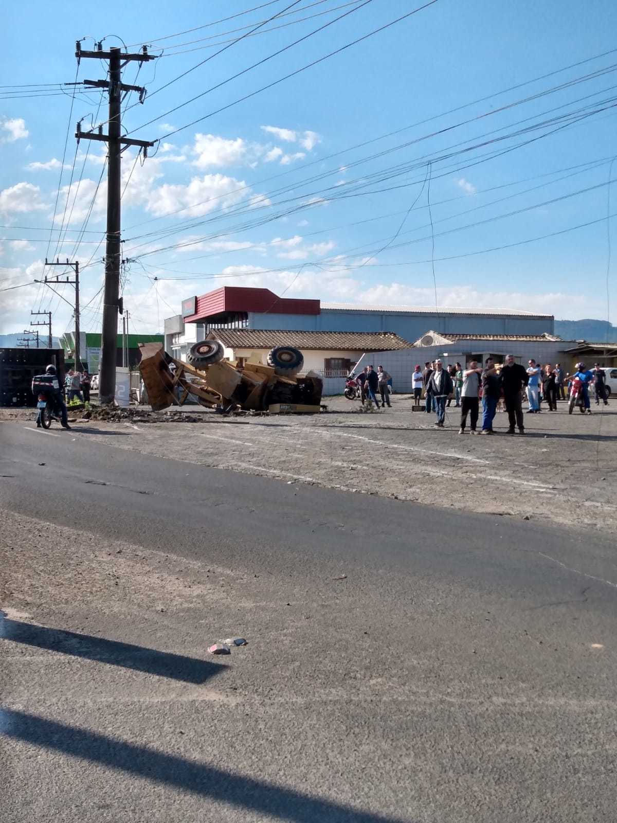 O caminhão carregava uma máquina pá carregadeira que ficou danificada. A Polícia Militar Rodoviária (PMRv) está no local. O trânsito flui por desvios. Ao cair, a máquina transportada pelo veículo danificou postes da região e parte da cidade está sem energia.