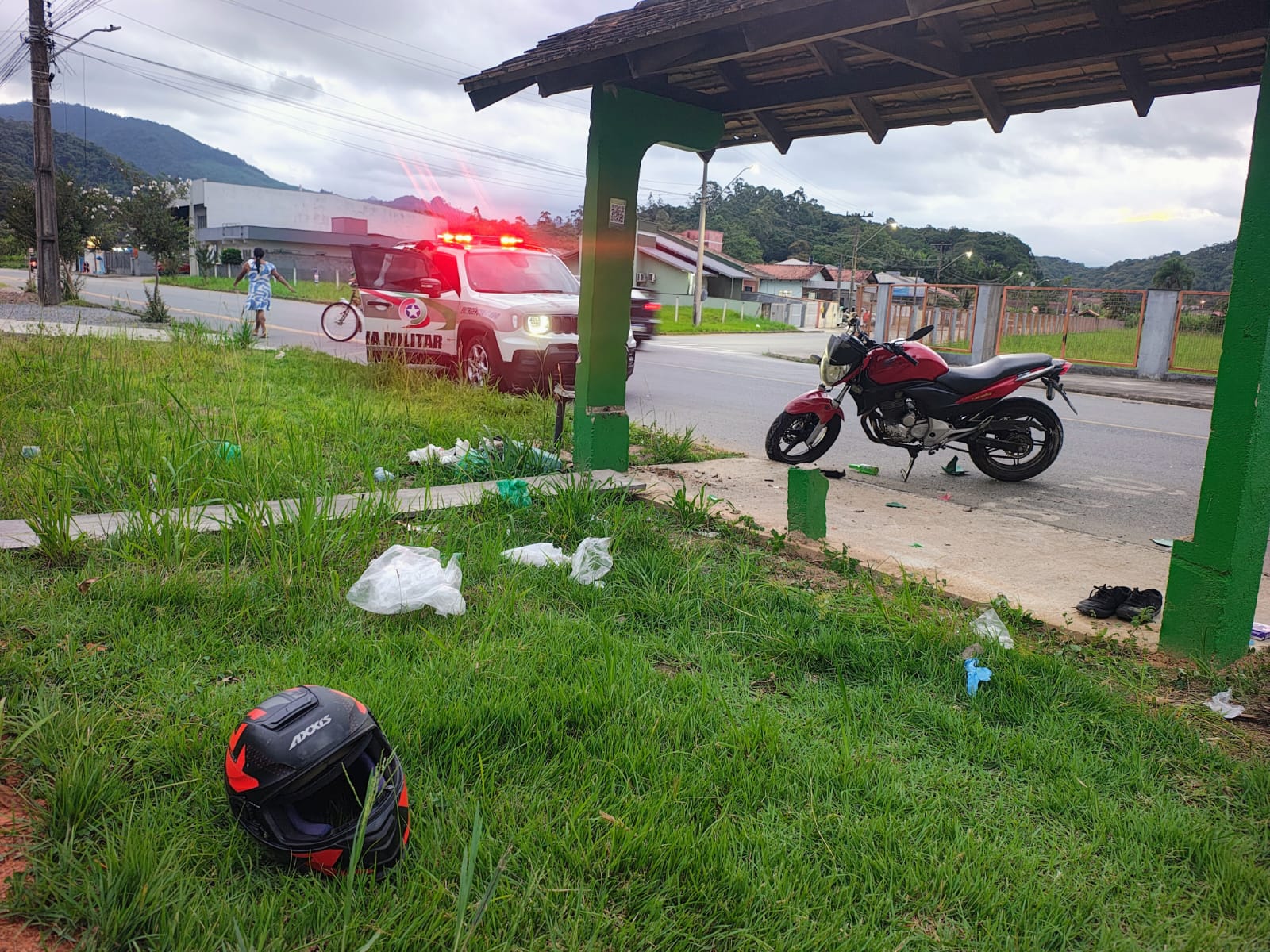 Segundo informações apuradas no local, um VW Gol saía da rua Francisco Greter e, ao acessar a via principal, cortou a frente de uma motocicleta Honda CB 300. Com o impacto, o motociclista foi arremessado contra um ponto de ônibus.