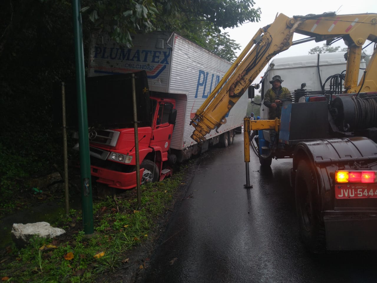 Motorista joga caminhão contra barranco após perder os freios na Serra Dona Francisca