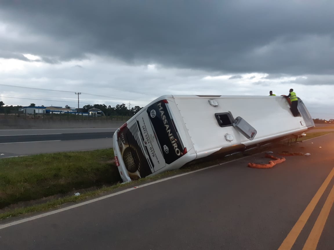 Um ônibus com 53 passageiros tombou na BR-101 em Laguna, no Sul do Estado, na madrugada desta quinta-feira (9). O veículo de turismo com placas de Brusque levava os passageiros de Joinville para Gramado.