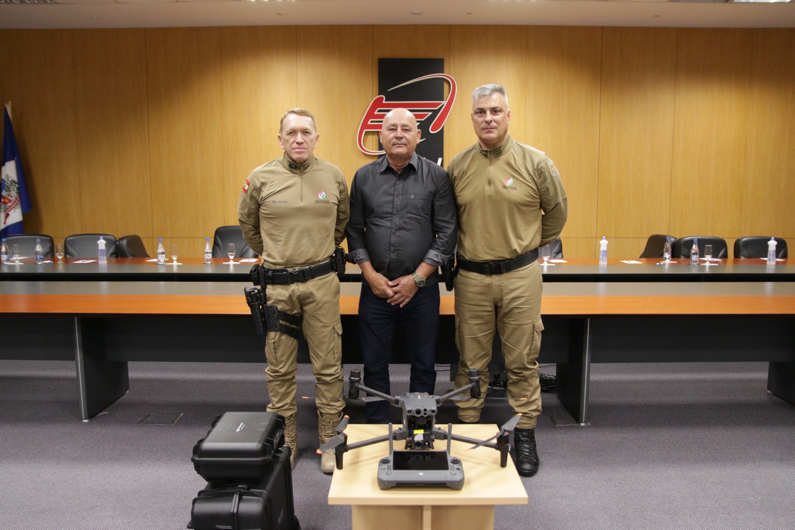 Durante o evento, foi entregue um drone de alto rendimento adquirido pela iniciativa privada com intermédio da Associação de Amigos da Segurança Pública de Joinville ao 5º CRPM.