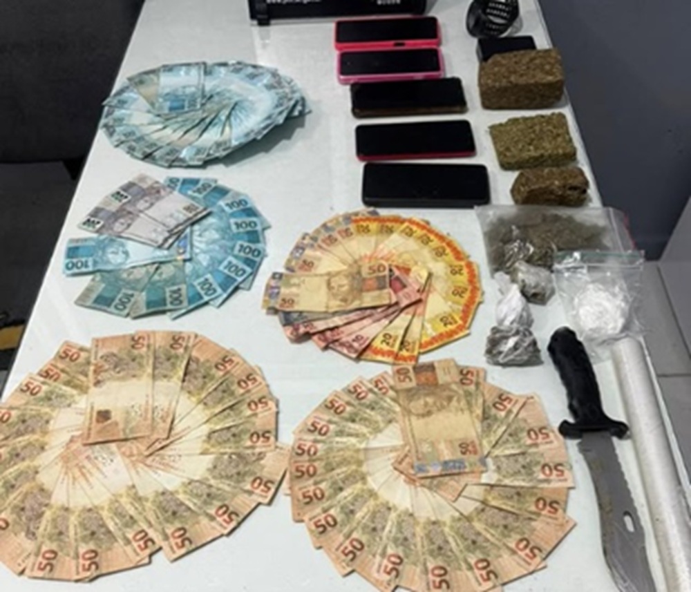 A ação ocorreu durante patrulhamento de rotina, quando os policiais localizaram o casal e realizaram a abordagem. Com eles, foi apreendido um pote contendo 526 gramas de maconha, 48 gramas de cocaína, cinco aparelhos celulares, além de R$ 5.732,00 em dinheiro.