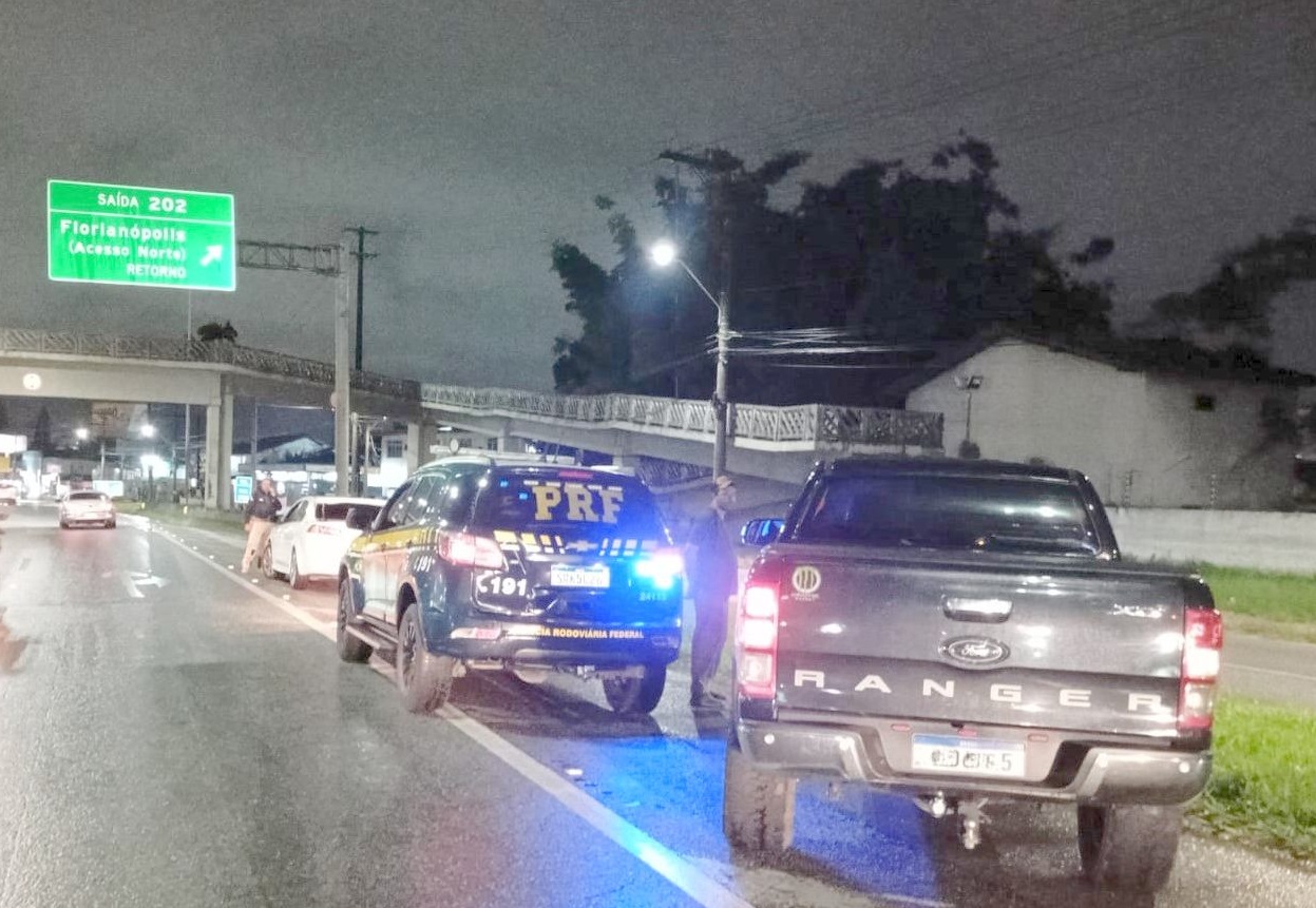 Policiais rodoviários federais detiveram dois homens que realizavam uma competição de velocidade ilegal na região de Biguaçu, na Grande Florianópolis. O flagrante ocorreu na noite de terça-feira passada (24) enquanto os condutores realizavam manobras perigosas em meio ao tráfego intenso e sob pista molhada, mas as informações só foram divulgadas nesta segunda-feira (03) pela PRF.