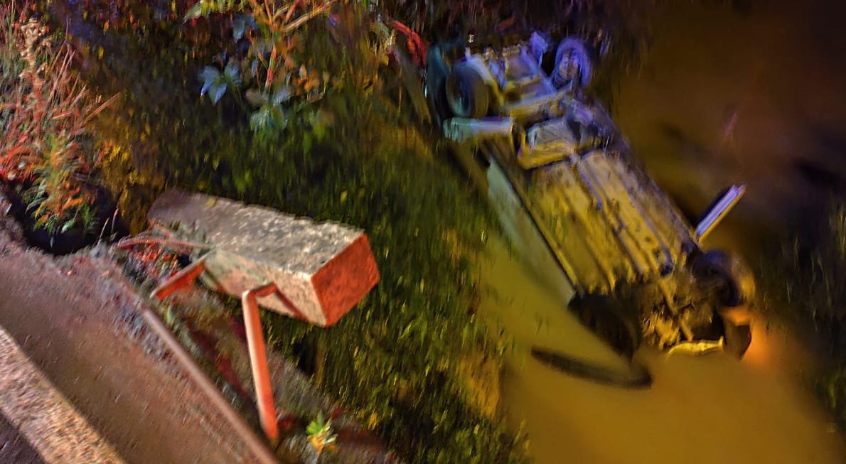Um policial militar resgatou um homem preso dentro de um carro após o veículo cair de uma ponte e ficar parcialmente submerso no rio, na noite desta segunda-feira (3), em Massaranduba.