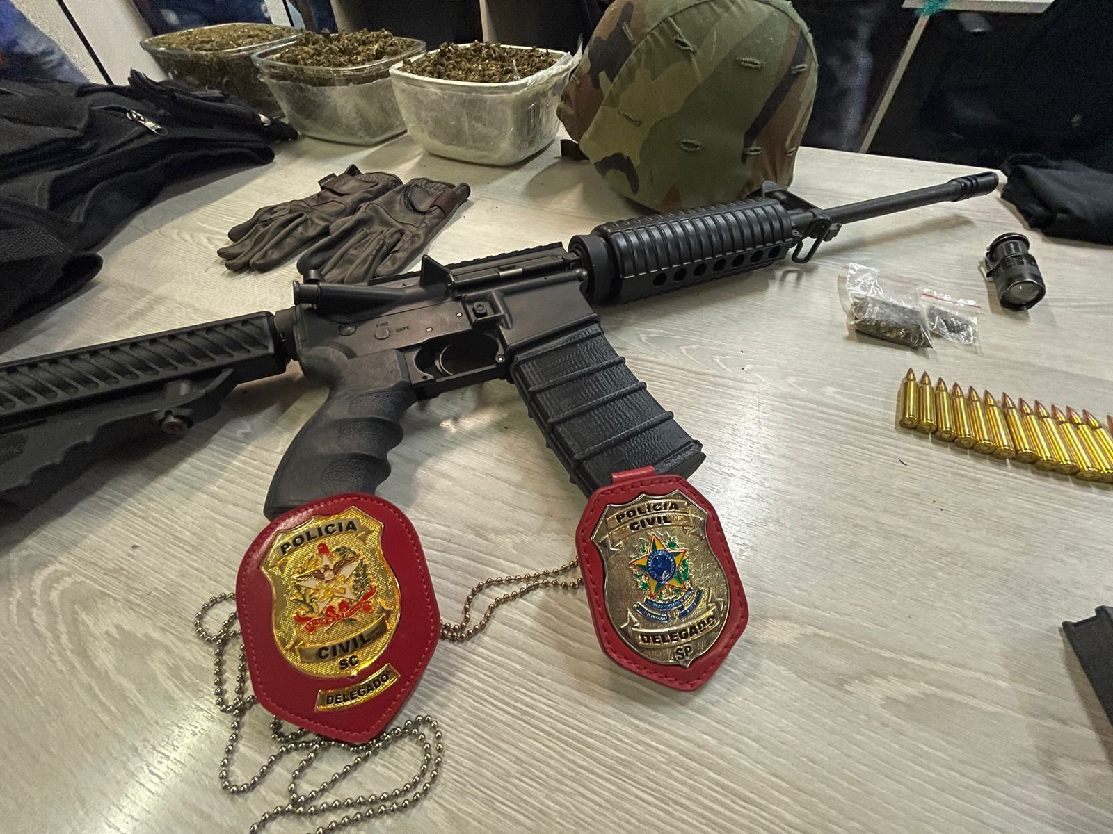 Com ele, foram apreendidos uma carabina (fuzil) calibre 5.56, munições, capacete e colete balísticos, roupas táticas e equipamentos usados em roubos, especialmente contra bancos.