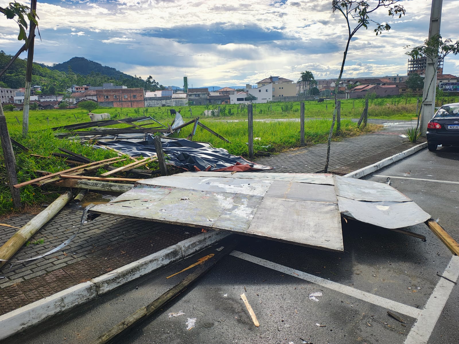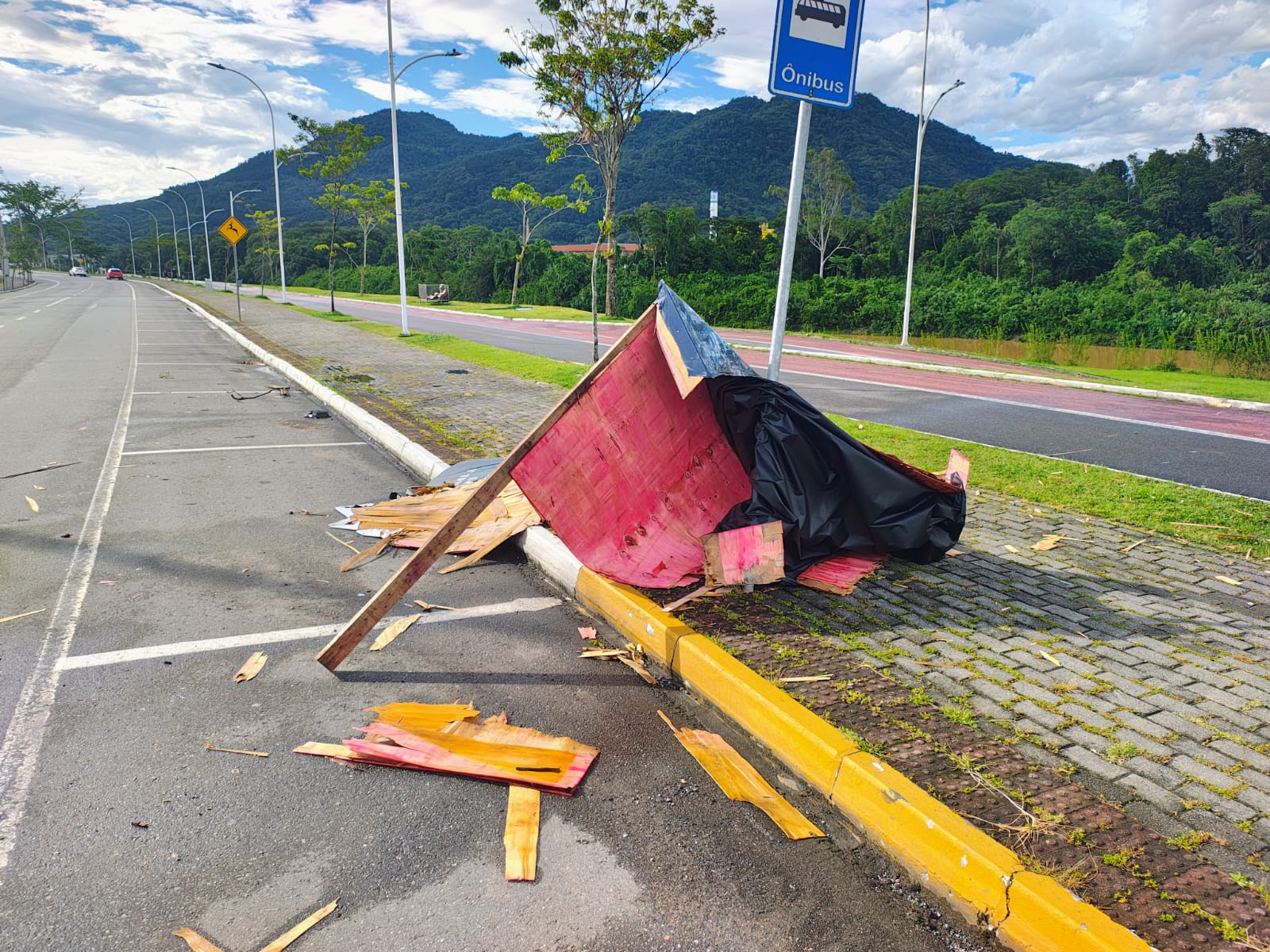 O forte temporal registrado na tarde deste domingo (11) provocou estragos em diferentes pontos de Jaraguá do Sul. No bairro Ilha da Figueira, na rua José Theodoro Ribeiro, a força do vento derrubou placas de publicidade, que foram arremessadas contra pontos de ônibus, causando danos às estruturas.